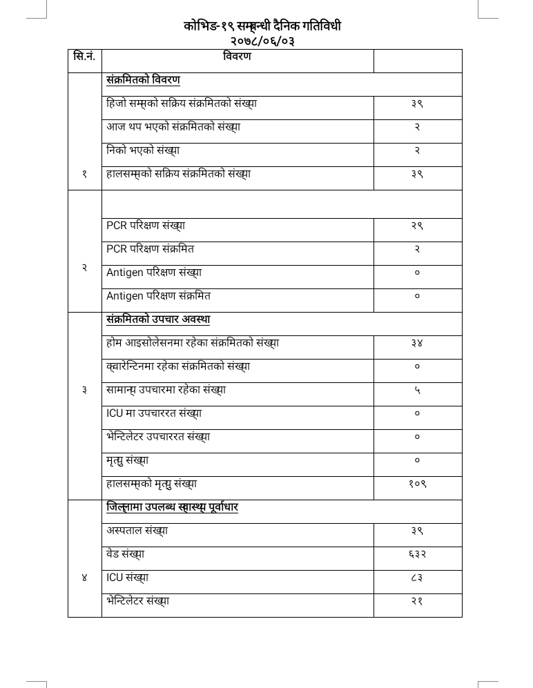 २०७८/०६/०३ काेभिड १९ सम्बन्धी दैनिक गतिविधी