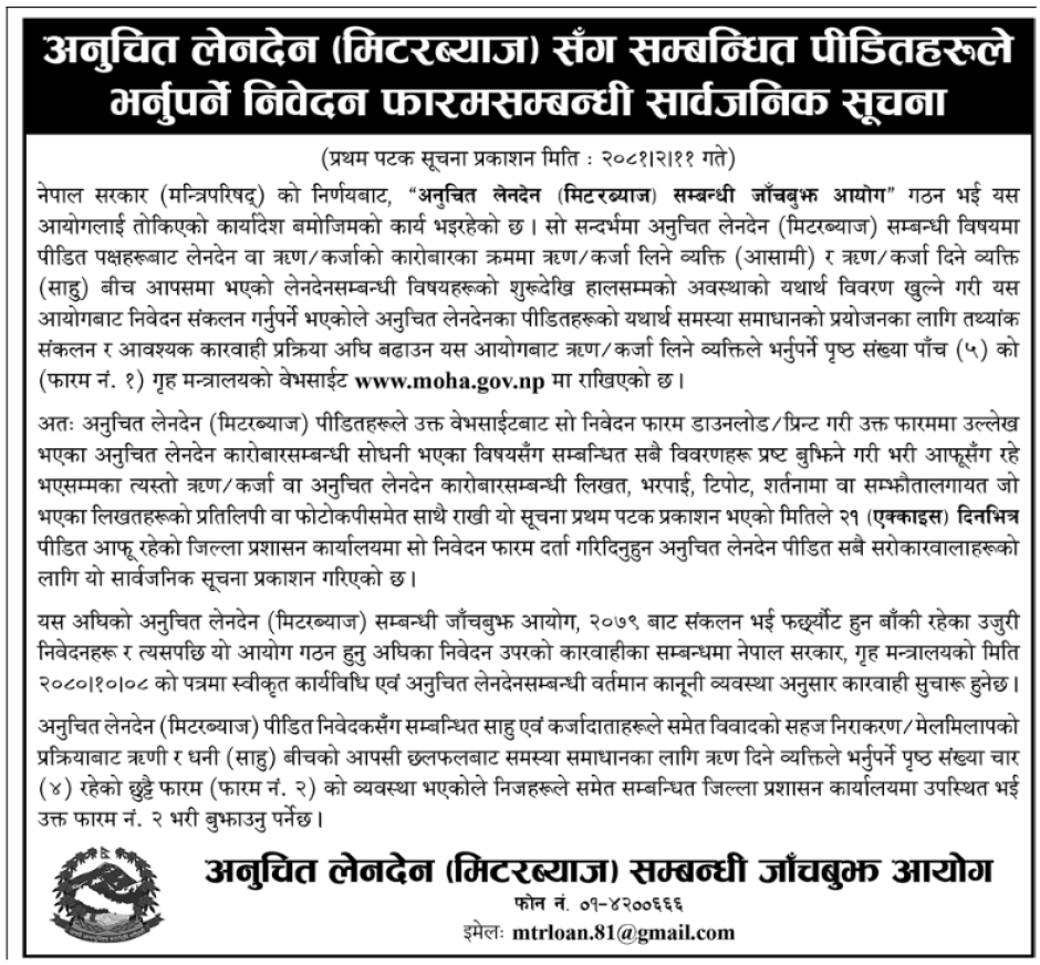 अनुचित लेनदेन(मिटरब्याज)सँग सम्बन्धित पीडितहरुले भर्नुपर्ने निवेदन फारमसम्बन्धी सार्वजनिक सूचना !!!