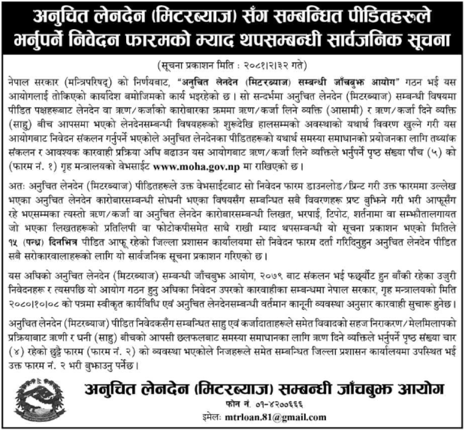 अनुचित लेनदेन(मिटरब्याज)सँग सम्बन्धित पीडितहरुले भर्नुपर्ने निवेदन फारमको म्याद थप सम्बन्धी सार्वजनिक सूचना