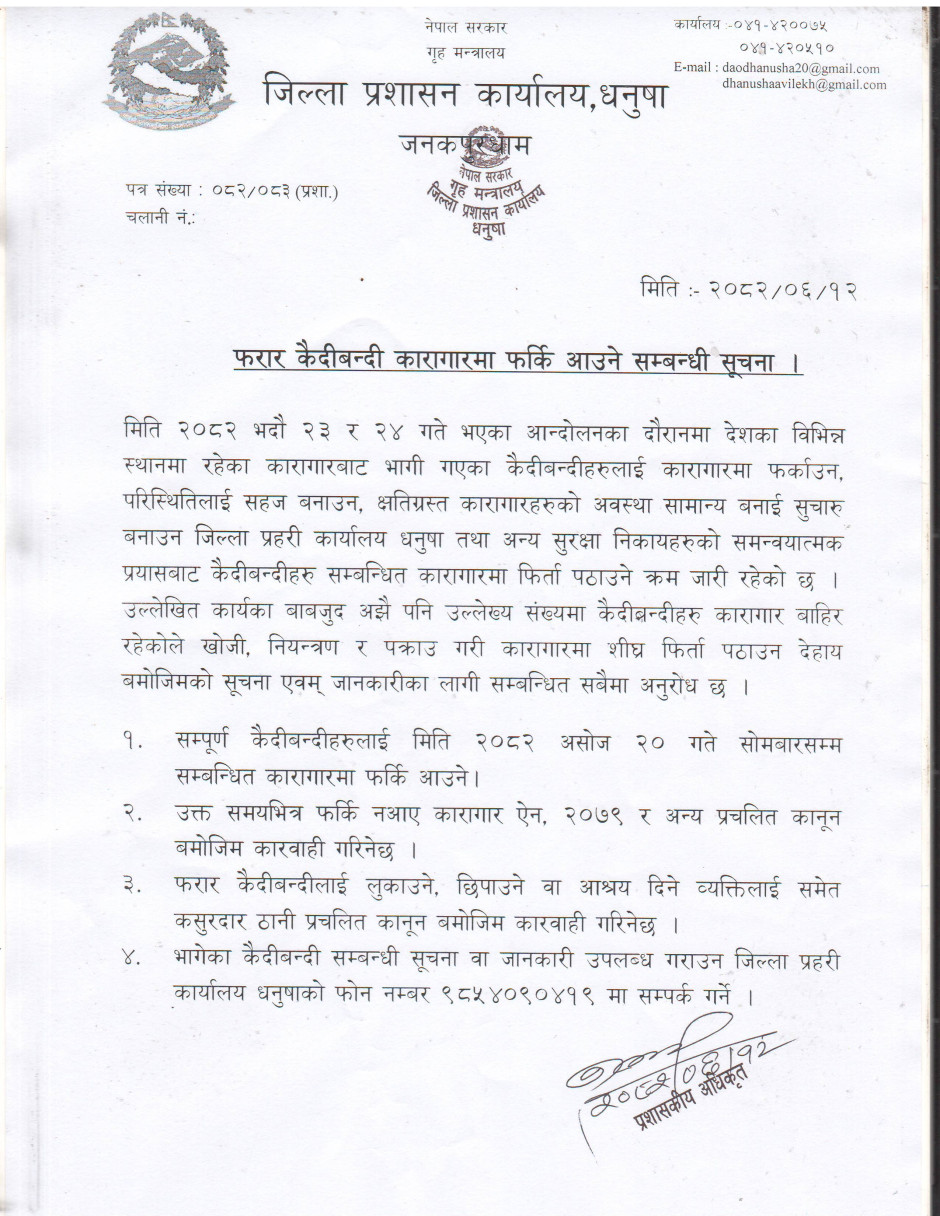 जिल्ला प्रशासन कार्यालय धनुषाबाट जारी गरिएको सूचना ।