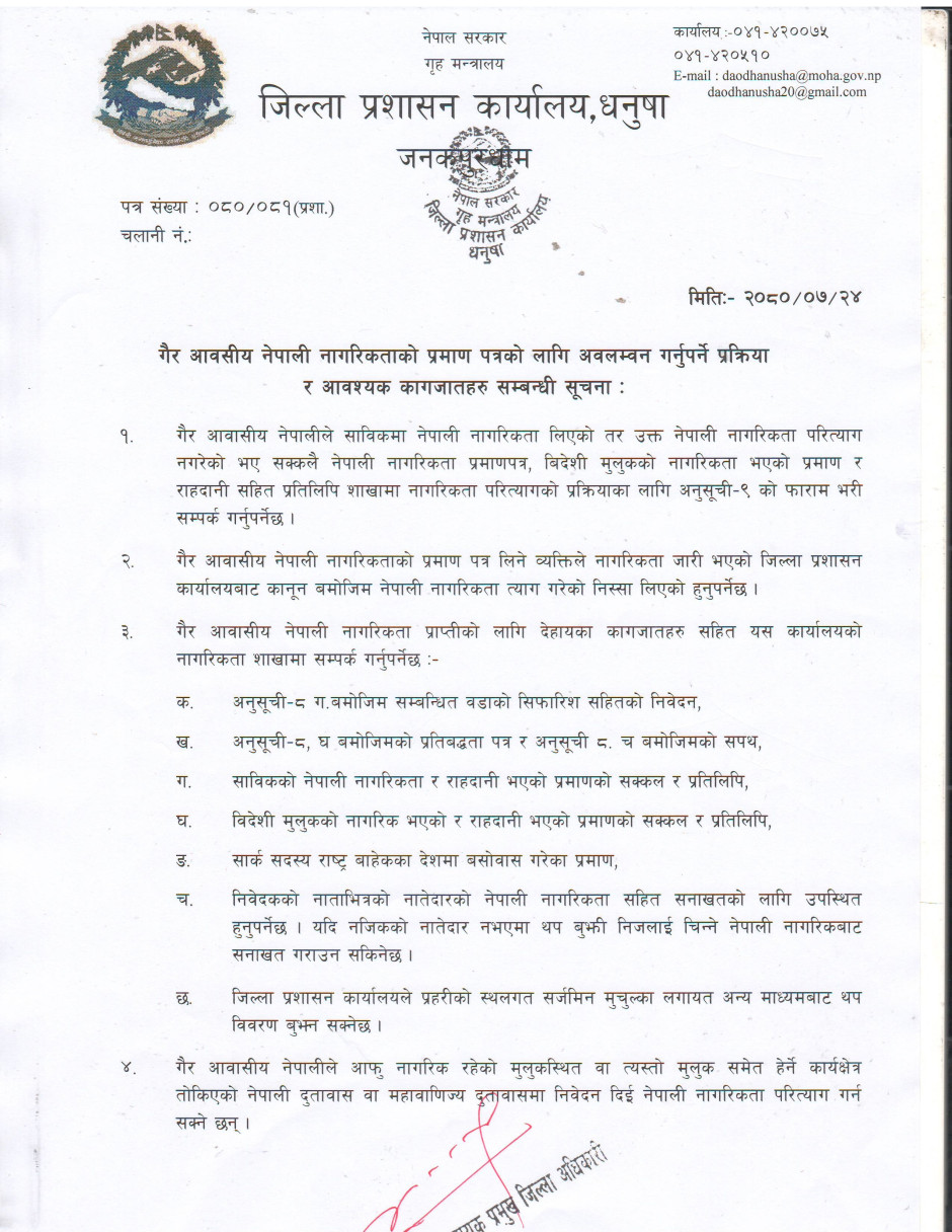 गैर आवासीय नेपाली नागरिकताको प्रमाण पत्रको लागि अवलम्वन गर्नुपर्ने प्रक्रिया र आवश्यक कागजातहरु सम्बन्धी सूचना