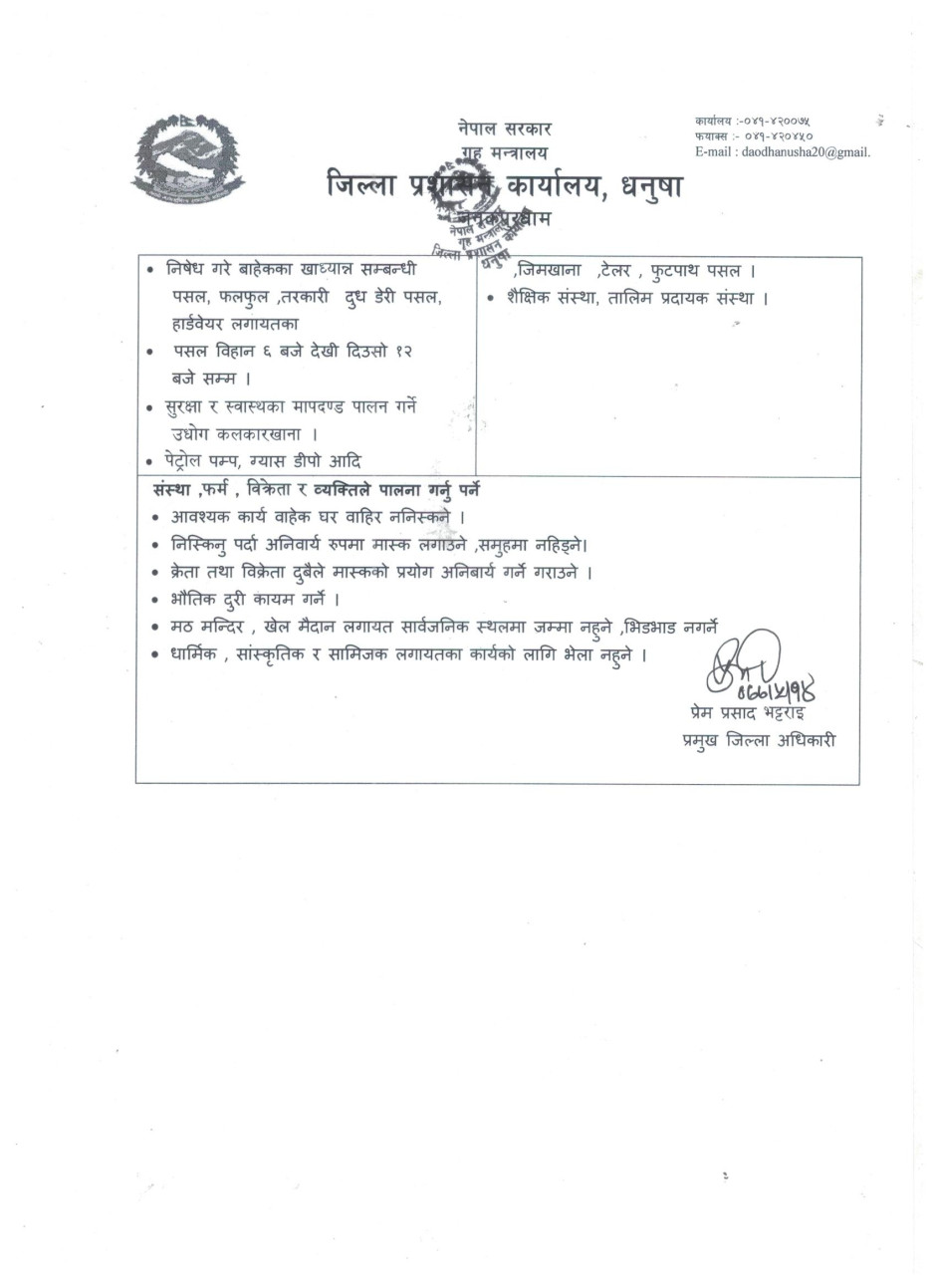 २०७७-५-१४ गते जिल्ला प्रशासन कार्यालय धनुषाबाट जारी गरिएको आदेश