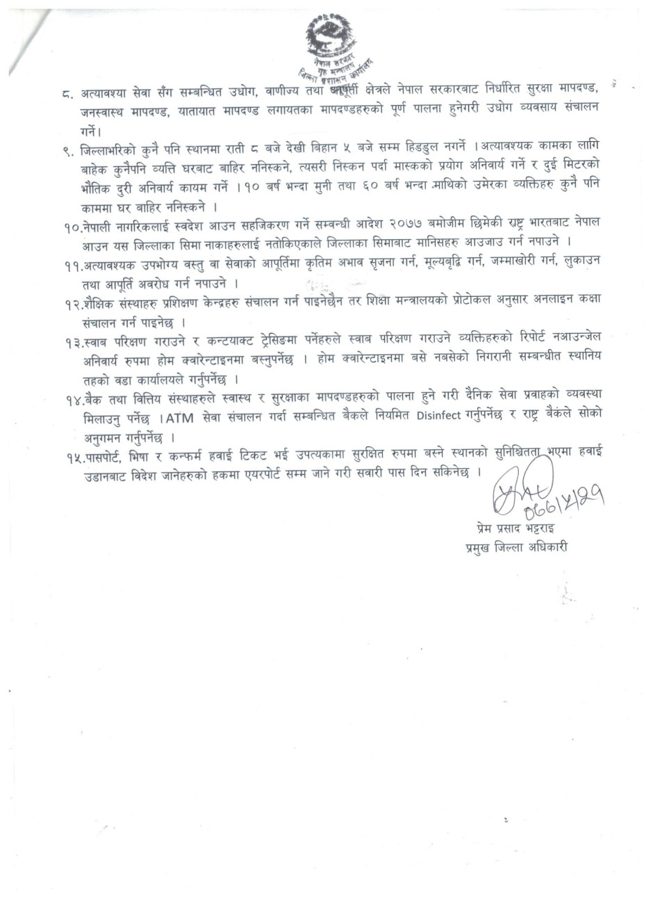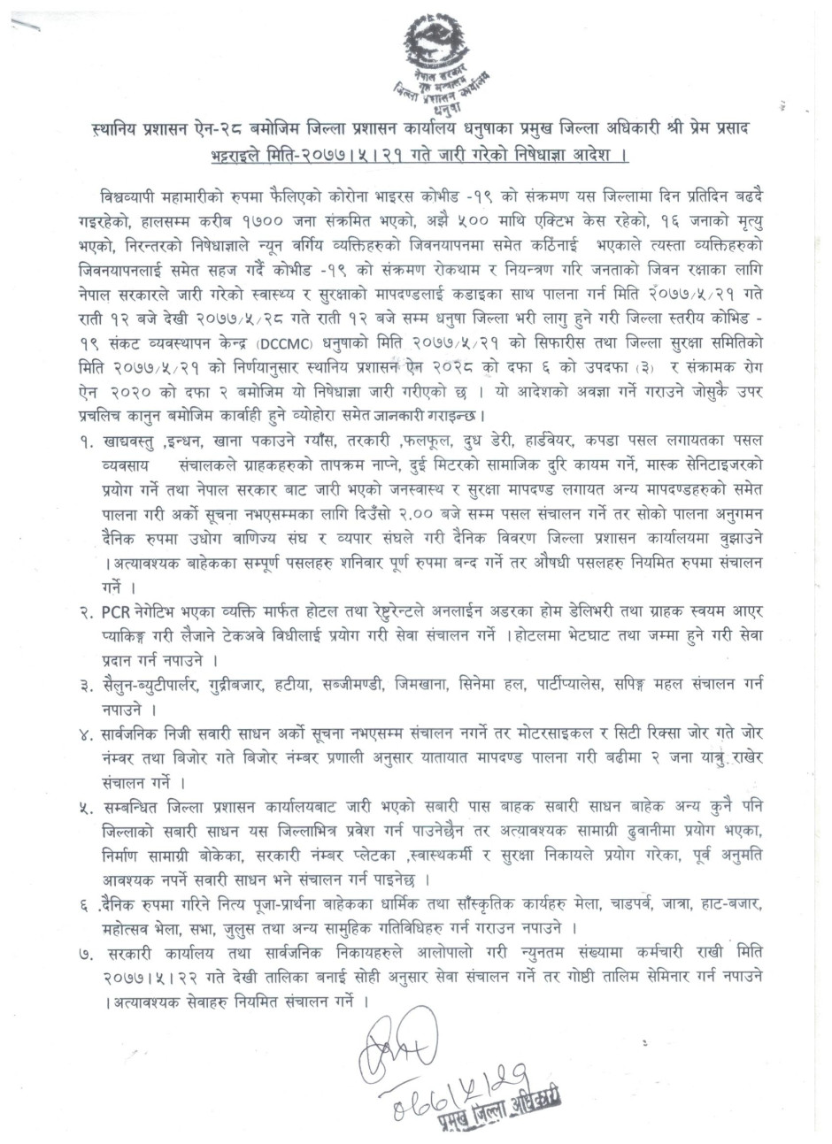 २०७७-५-२१ गते जिल्ला प्रशासन कार्यालय धनुषाबाट जारी गरिएको निषेधाज्ञा आदेश