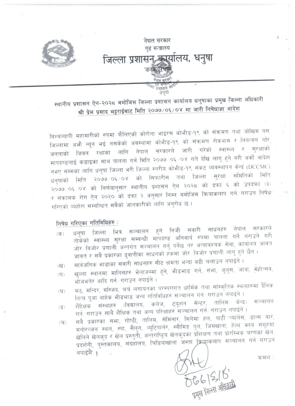 २०७७-६-४ गते जिल्ला प्रशासन कार्यालय धनुषाबाट जारी गरिएको निषेधाज्ञा आदेश