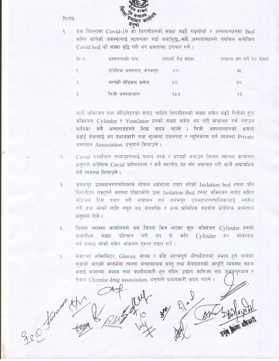 धनुषा जिल्लामा धार्मिक सहिष्णुता एवं सामाजिक सदभाव कायम राख्न जिल्लास्थित सुरक्षा निकायका पदाधिकारीहरु, जिल्लास्थित राजनितीक दल, जनकपुर उद्योग वाणिज्य संघ, जिल्ला पत्रकार महासंघ, सामाजिक साँस्कृतिक एवं धार्मिक क्षेत्रका अगुवाहरु सँग भएको बैठकको निर्णय