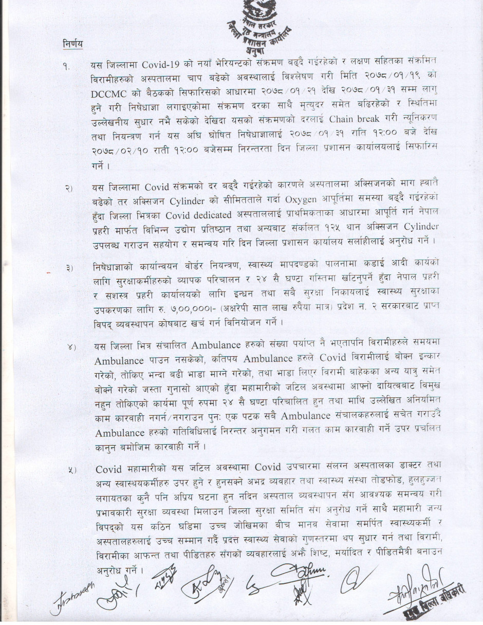 २०७८/०१/३० गते जिल्ला संकट व्यवस्थापन समितिबाट भएको निर्णय