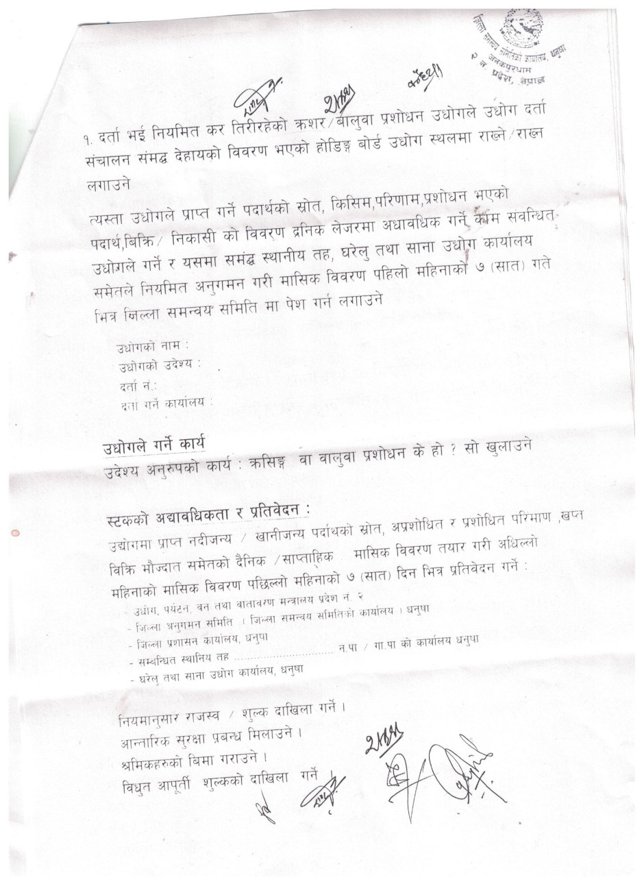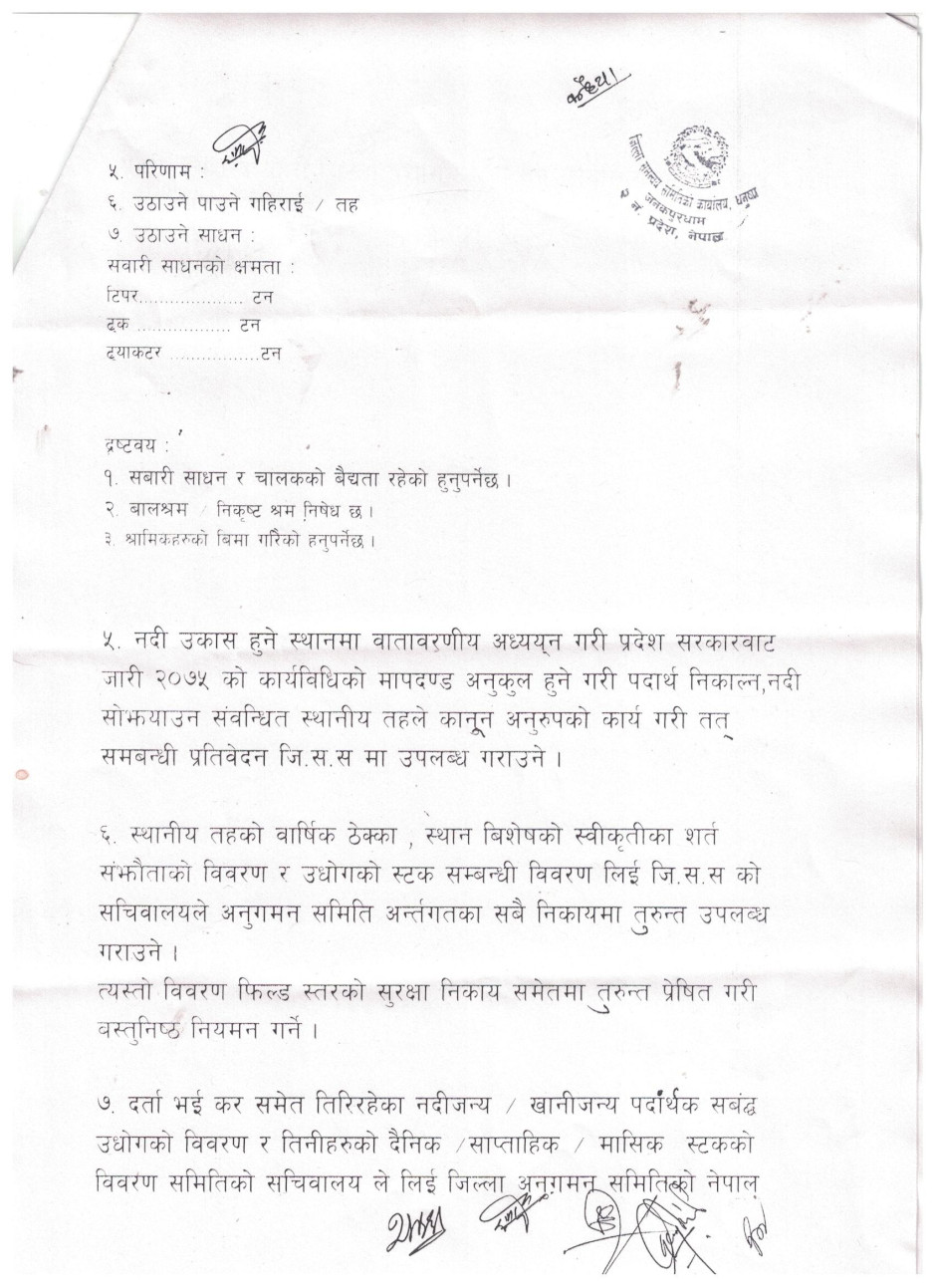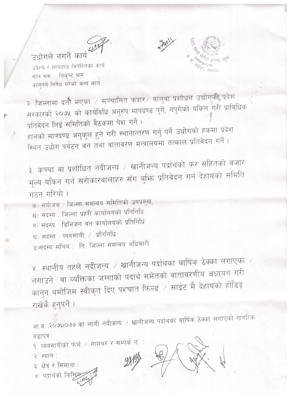 २०७६/११/१५ गतेको जिल्ला अनुगमन समितीको नदीजन्य तथा ढंगा, गिट्टी, बालुवा, खनीजन्य पदार्थको उत्खन्न संकलन र विक्रि सम्बन्धि बसेको बैठकबाट भएको निर्णय