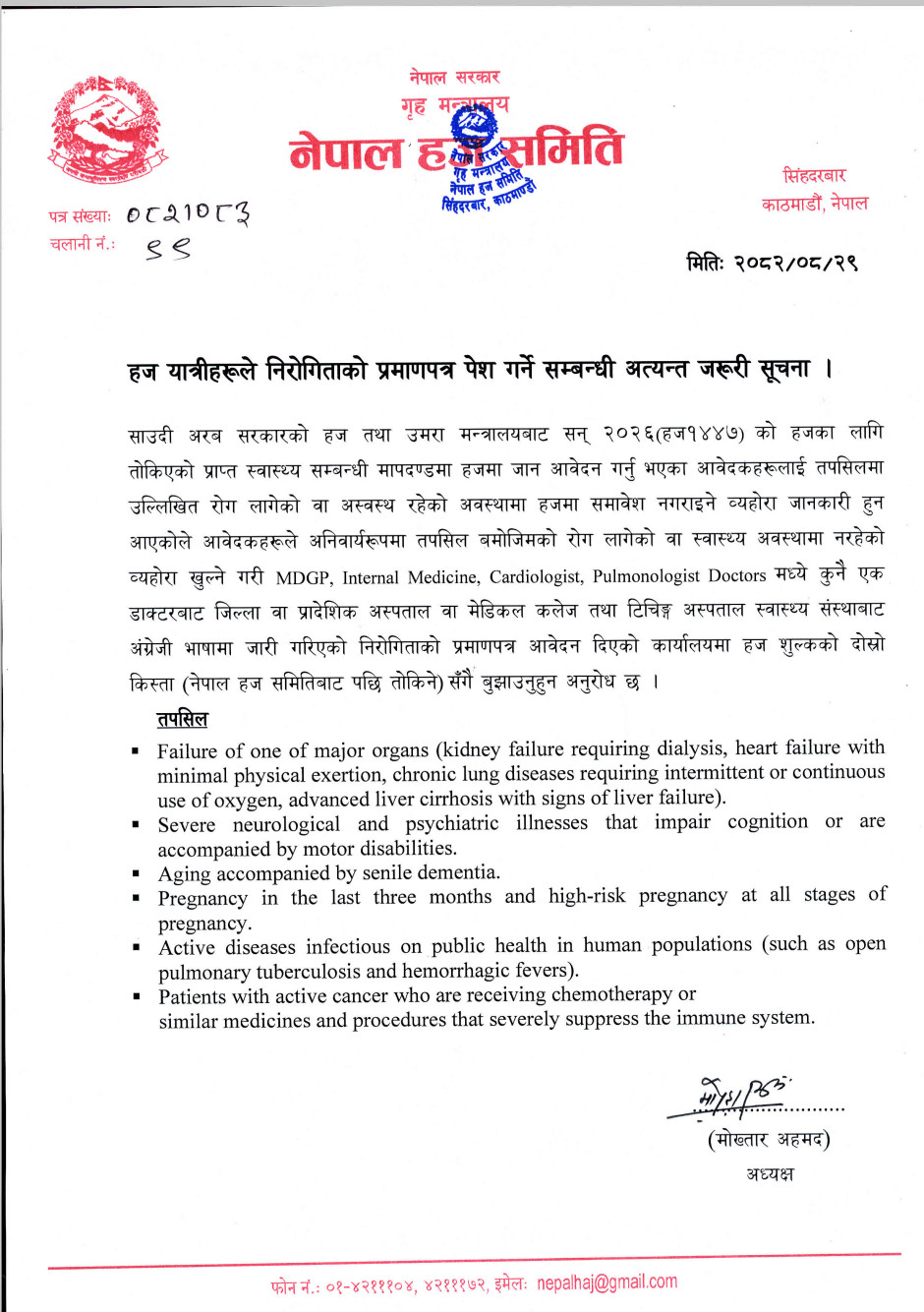 हज यात्रीहरुले निरोगिताको प्रमाणपत्र पेश गर्ने सम्बन्धी अत्यन्त्त जरुरी सूचना ।