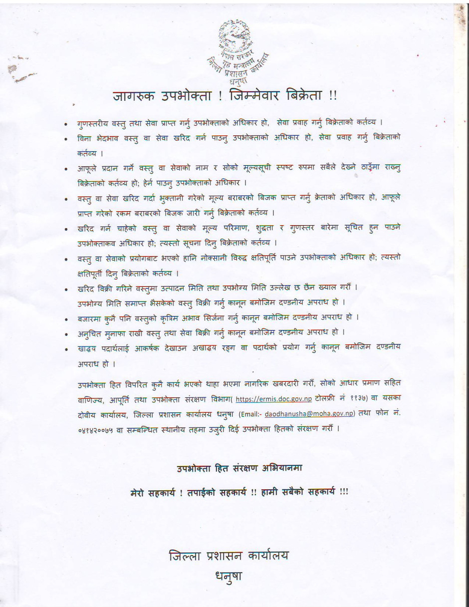 जिल्ला प्रशासन कार्यालय धनुषाबाट जारी गरिएको सूचना ।