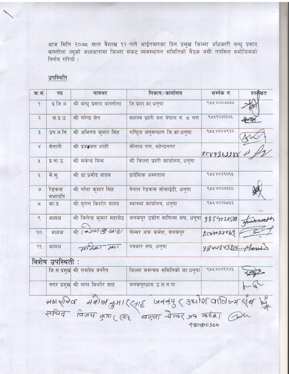 धनुषा जिल्लामा धार्मिक सहिष्णुता एवं सामाजिक सदभाव कायम राख्न जिल्लास्थित सुरक्षा निकायका पदाधिकारीहरु, जिल्लास्थित राजनितीक दल, जनकपुर उद्योग वाणिज्य संघ, जिल्ला पत्रकार महासंघ, सामाजिक साँस्कृतिक एवं धार्मिक क्षेत्रका अगुवाहरु सँग भएको बैठकको निर्णय