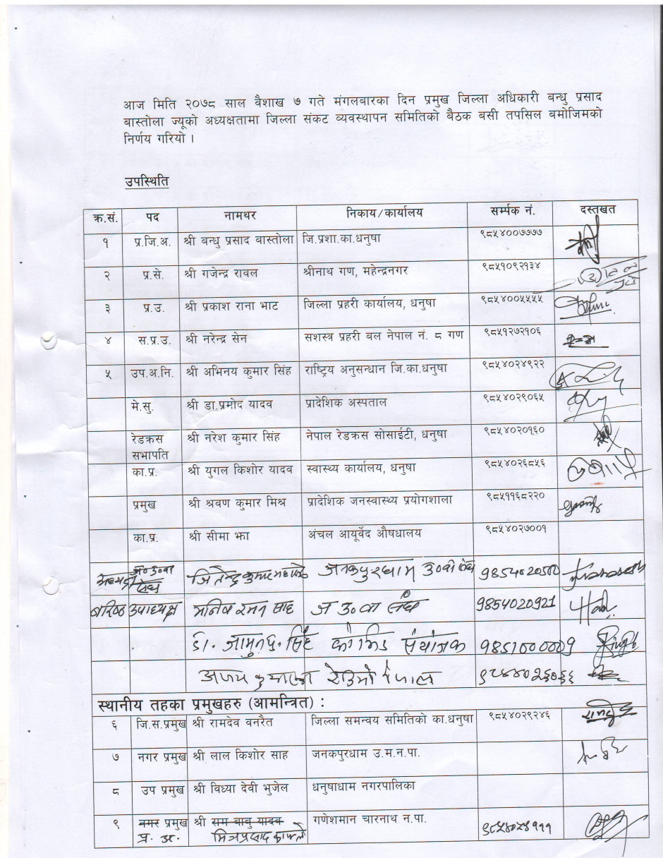 धनुषा जिल्लामा धार्मिक सहिष्णुता एवं सामाजिक सदभाव कायम राख्न जिल्लास्थित सुरक्षा निकायका पदाधिकारीहरु, जिल्लास्थित राजनितीक दल, जनकपुर उद्योग वाणिज्य संघ, जिल्ला पत्रकार महासंघ, सामाजिक साँस्कृतिक एवं धार्मिक क्षेत्रका अगुवाहरु सँग भएको बैठकको निर्णय