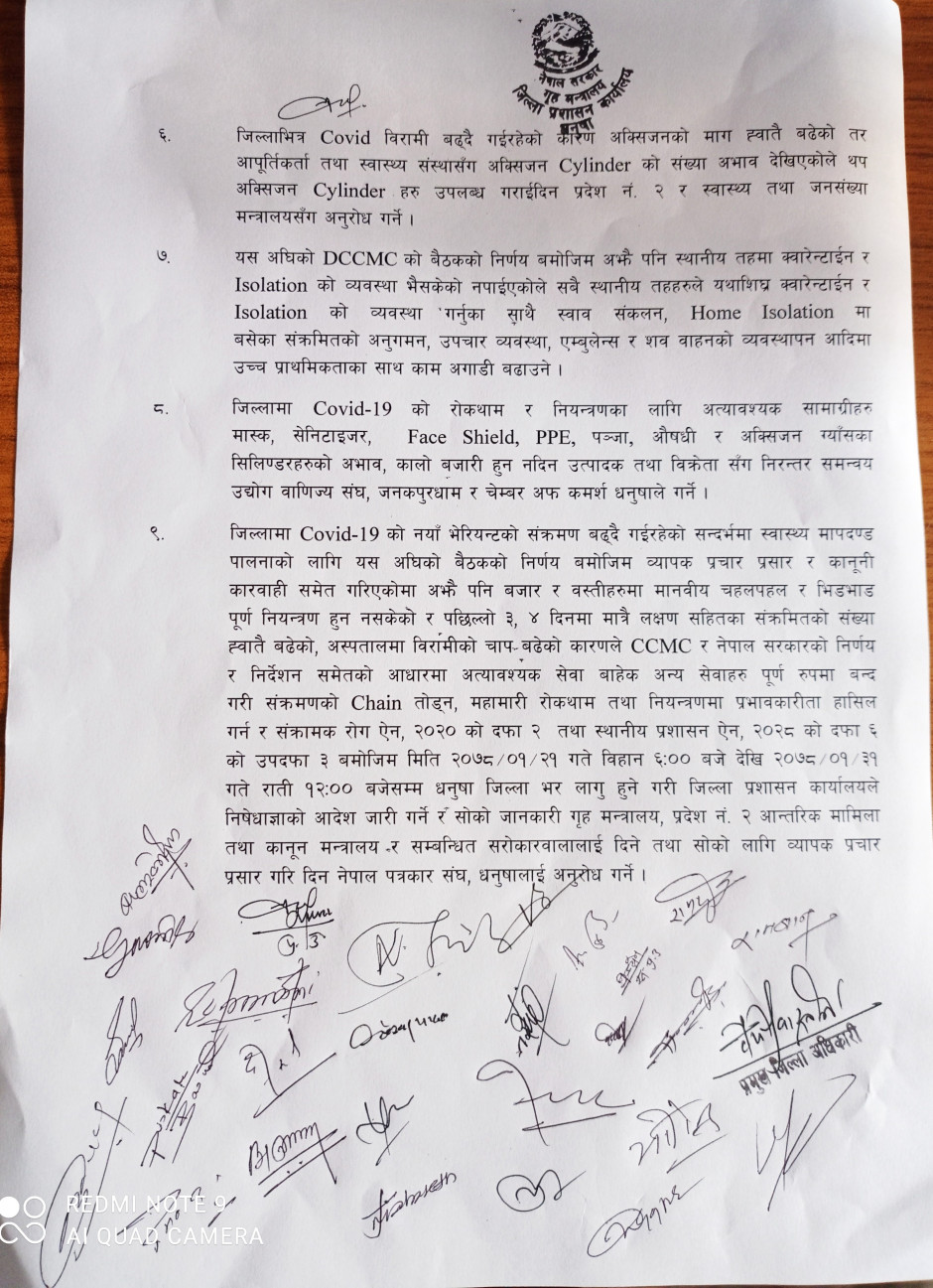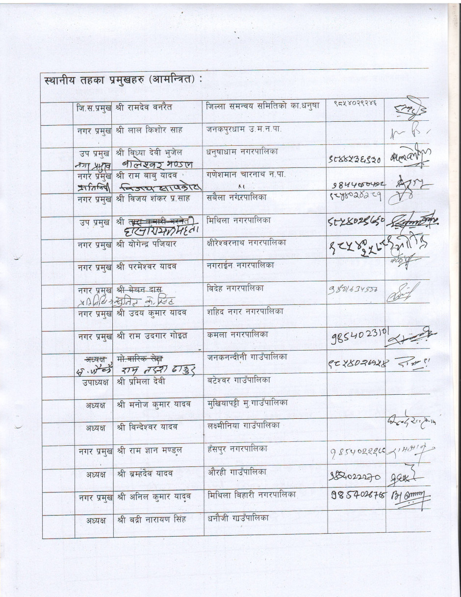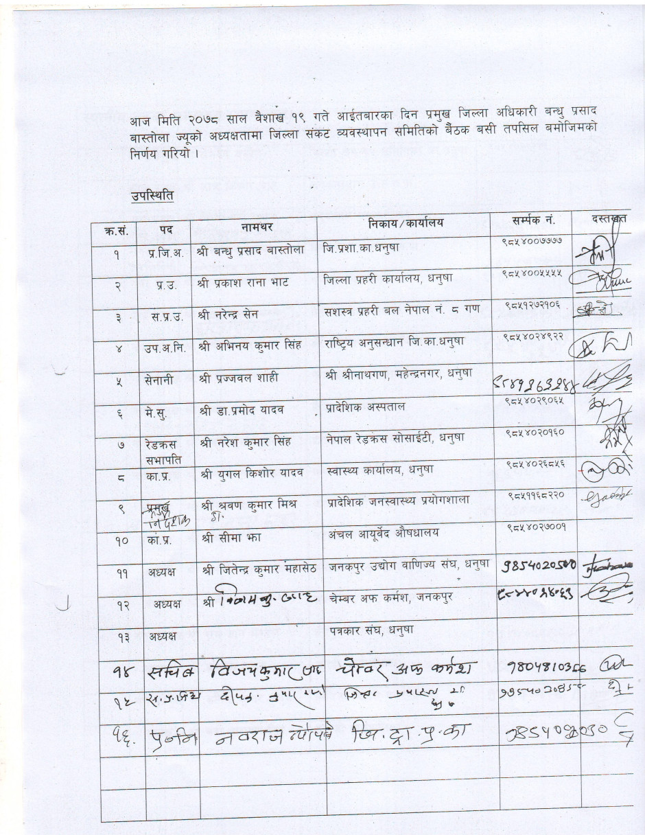 धनुषा जिल्लामा धार्मिक सहिष्णुता एवं सामाजिक सदभाव कायम राख्न जिल्लास्थित सुरक्षा निकायका पदाधिकारीहरु, जिल्लास्थित राजनितीक दल, जनकपुर उद्योग वाणिज्य संघ, जिल्ला पत्रकार महासंघ, सामाजिक साँस्कृतिक एवं धार्मिक क्षेत्रका अगुवाहरु सँग भएको बैठकको निर्णय
