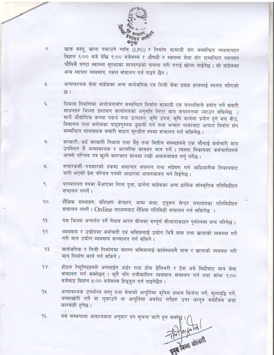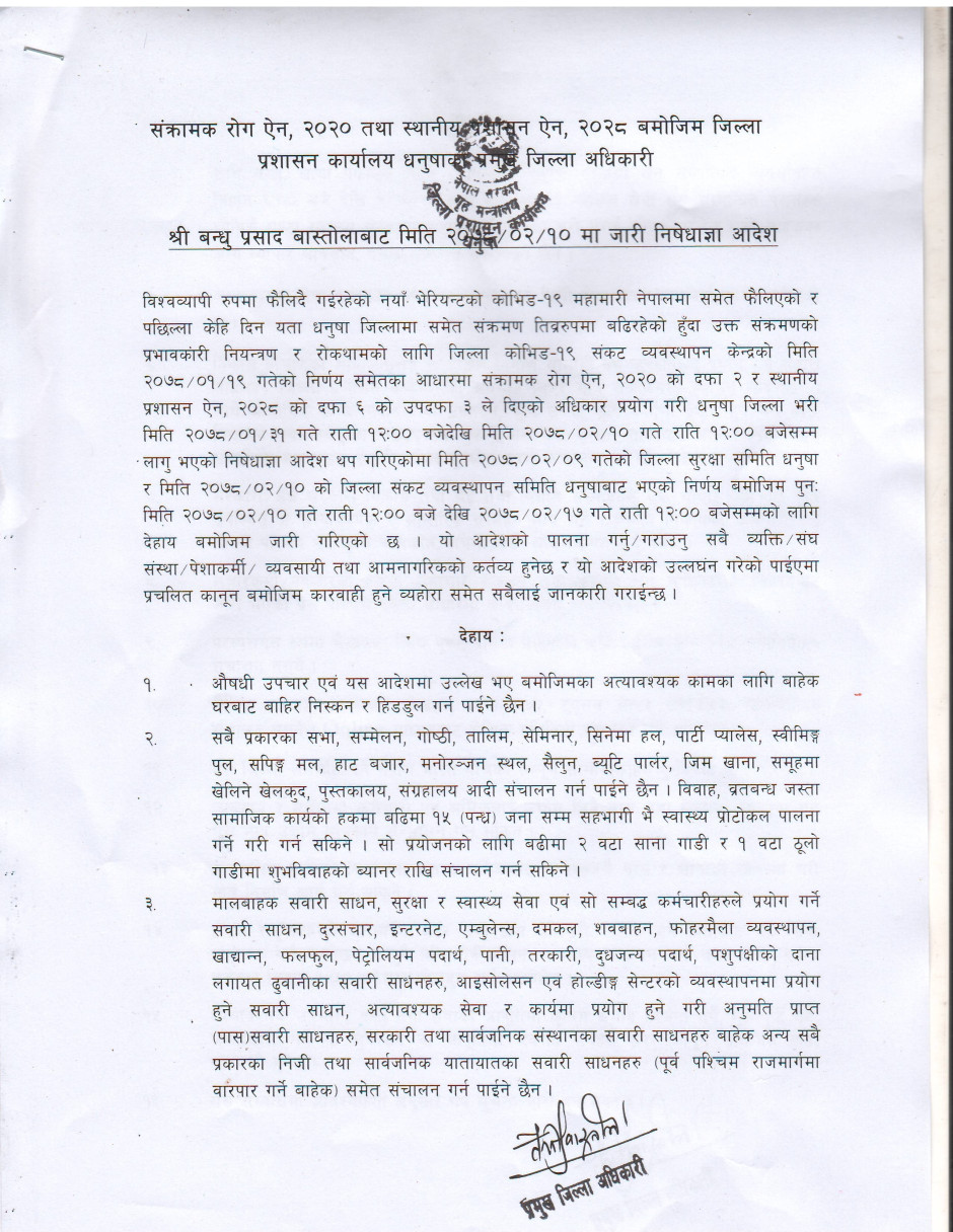 जिल्ला प्रशासन कार्यालय धनुषाबाट अवधि थप गरि जारी गरिएको निषेधाज्ञा आदेश