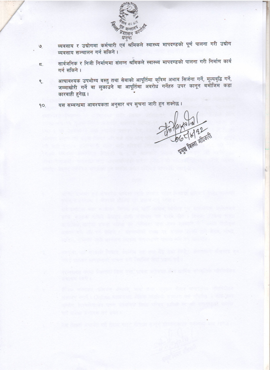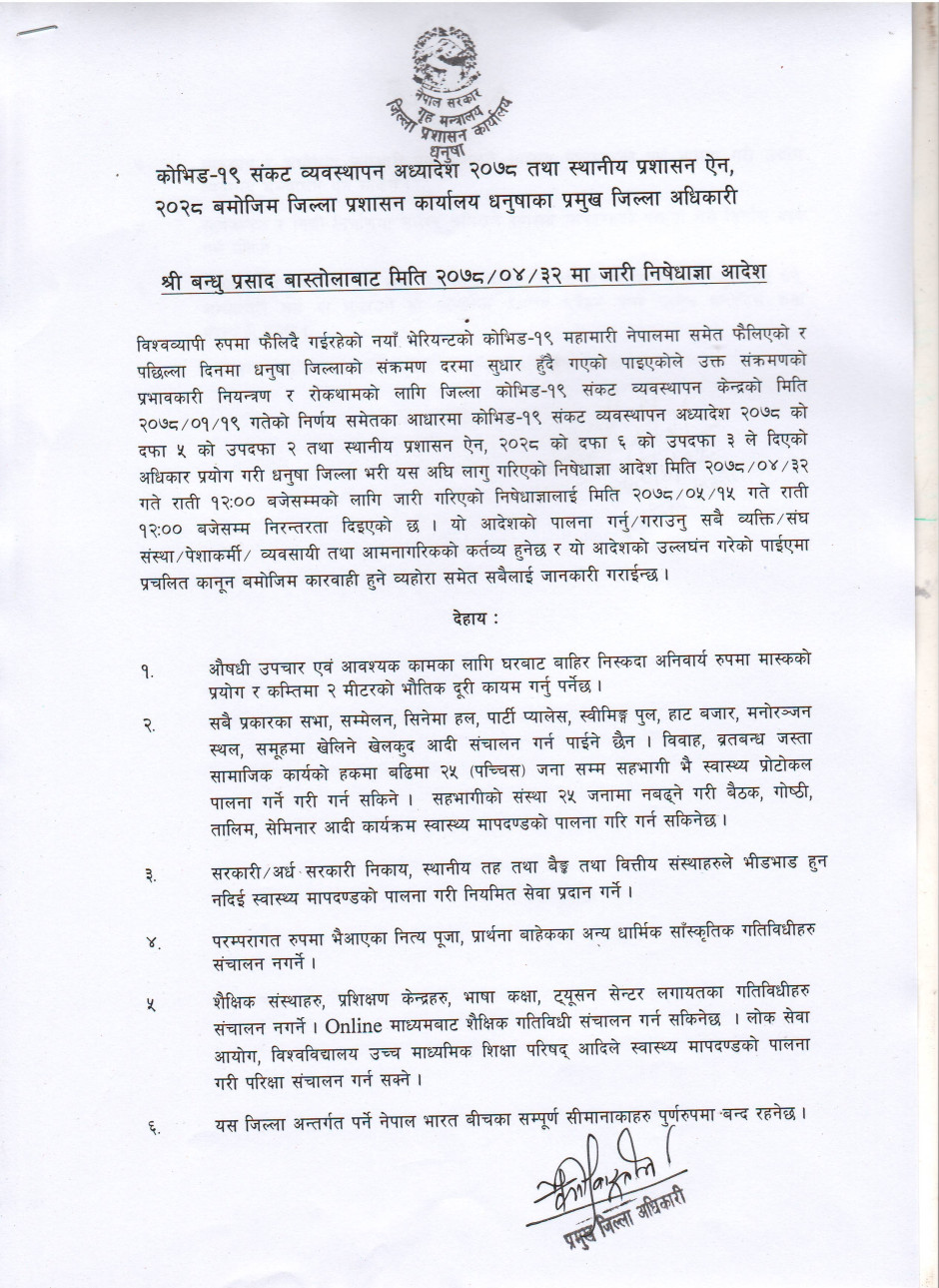 जिल्ला प्रशासन कार्यालय धनुषाबाट अवधि थप गरि जारी गरिएको निषेधाज्ञा आदेश