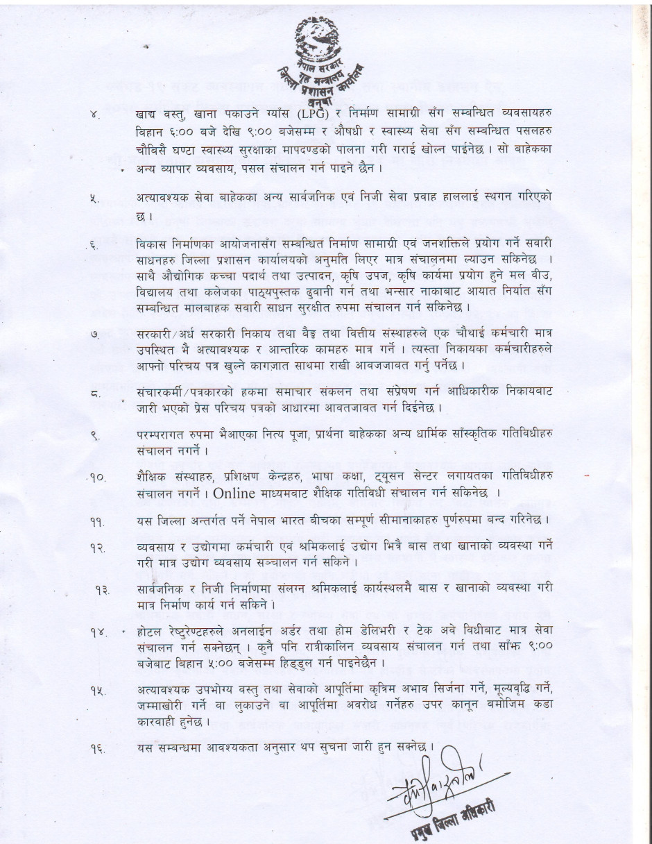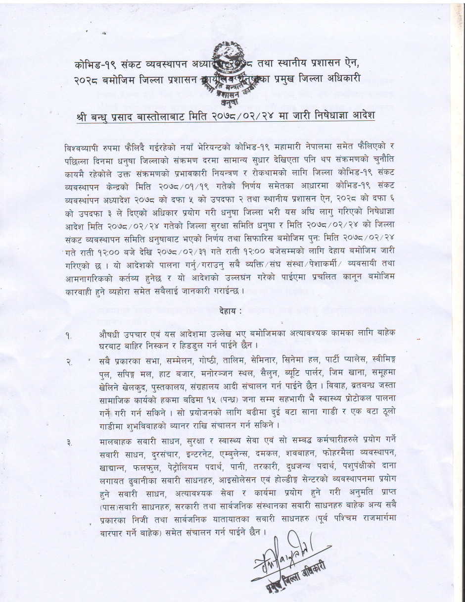 जिल्ला प्रशासन कार्यालय धनुषाबाट अवधि थप गरि जारी गरिएको निषेधाज्ञा आदेश