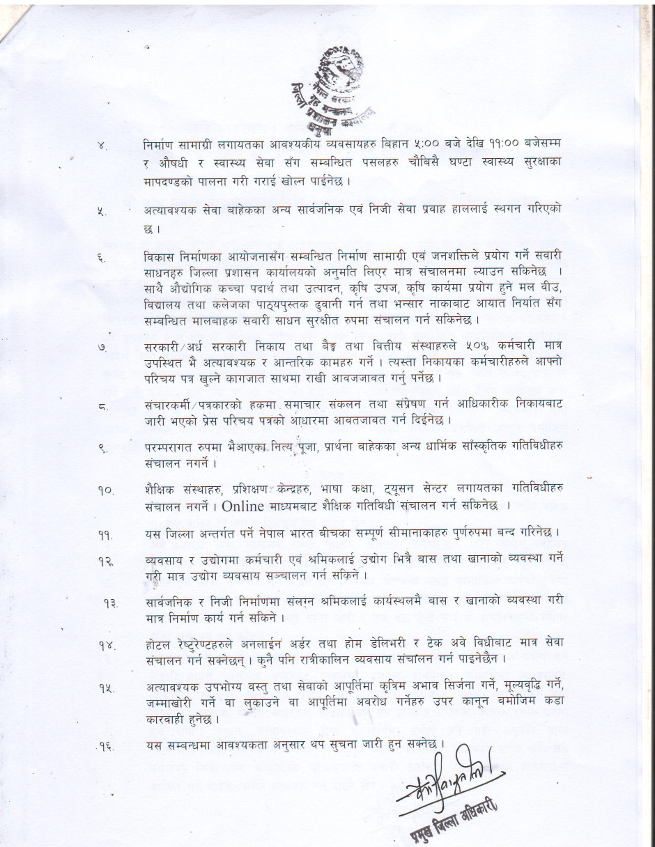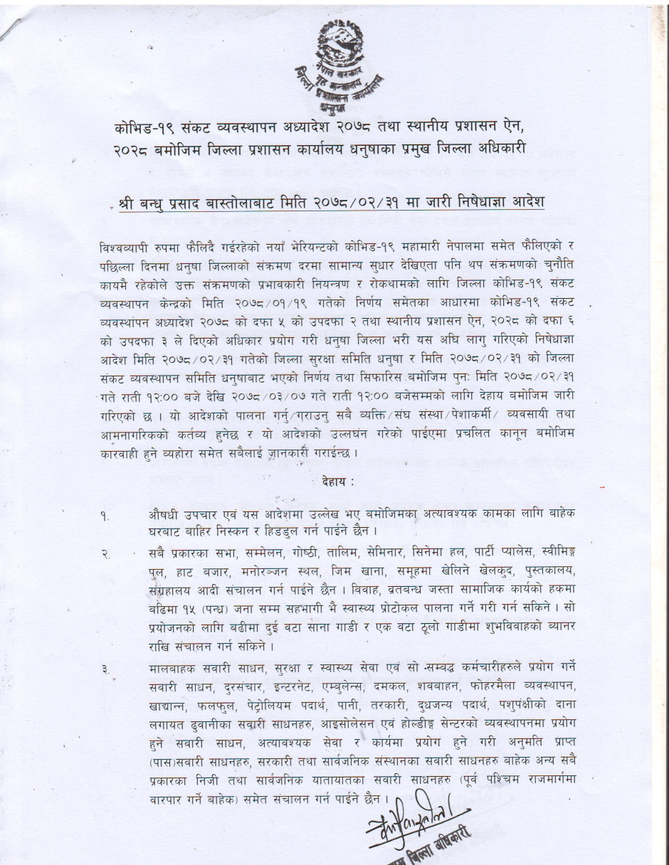 जिल्ला प्रशासन कार्यालय धनुषाबाट अवधि थप गरि जारी गरिएको निषेधाज्ञा आदेश