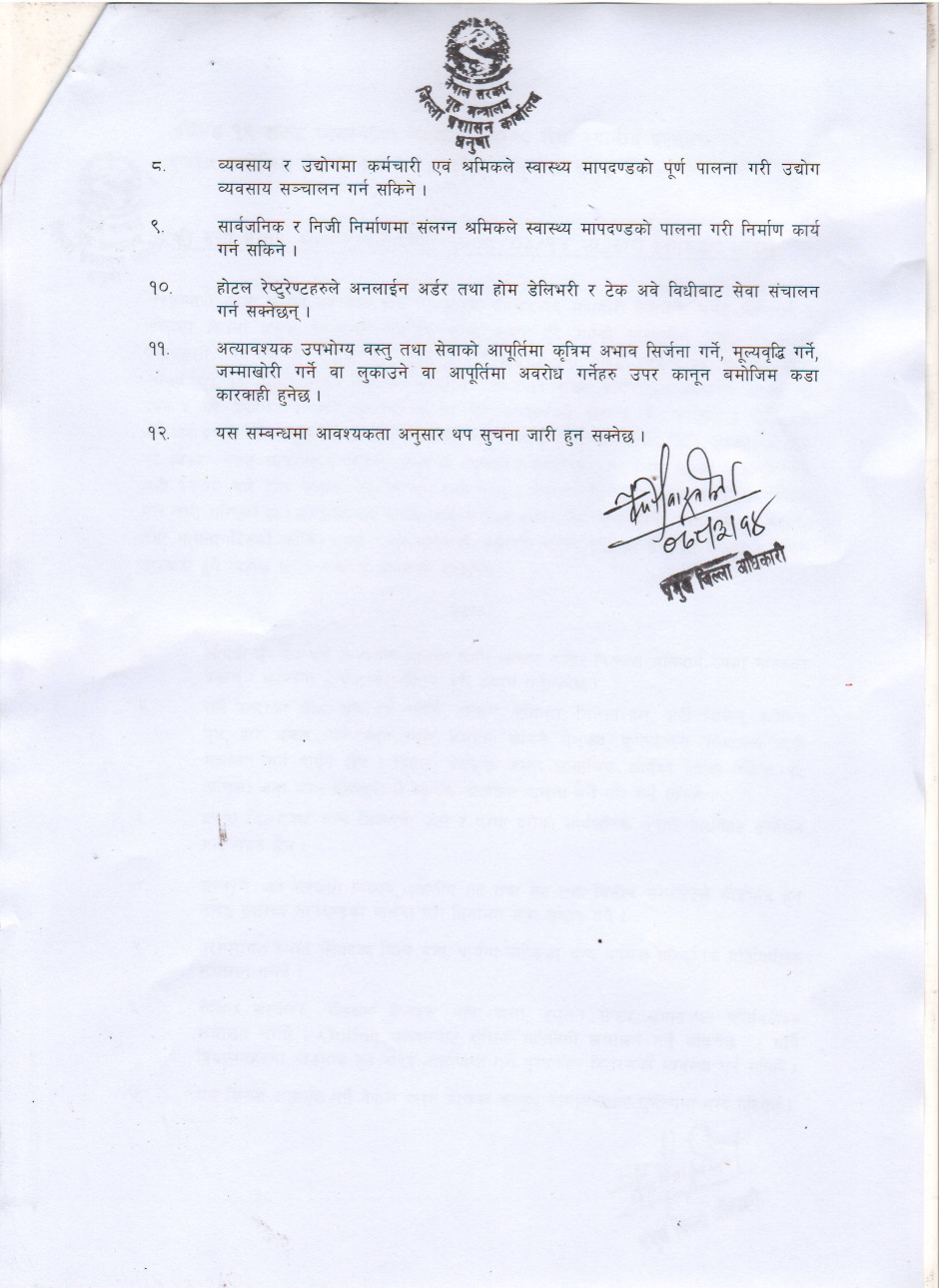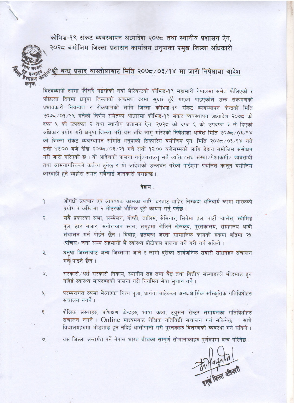 जिल्ला प्रशासन कार्यालय धनुषाबाट अवधि थप गरि जारी गरिएको निषेधाज्ञा आदेश