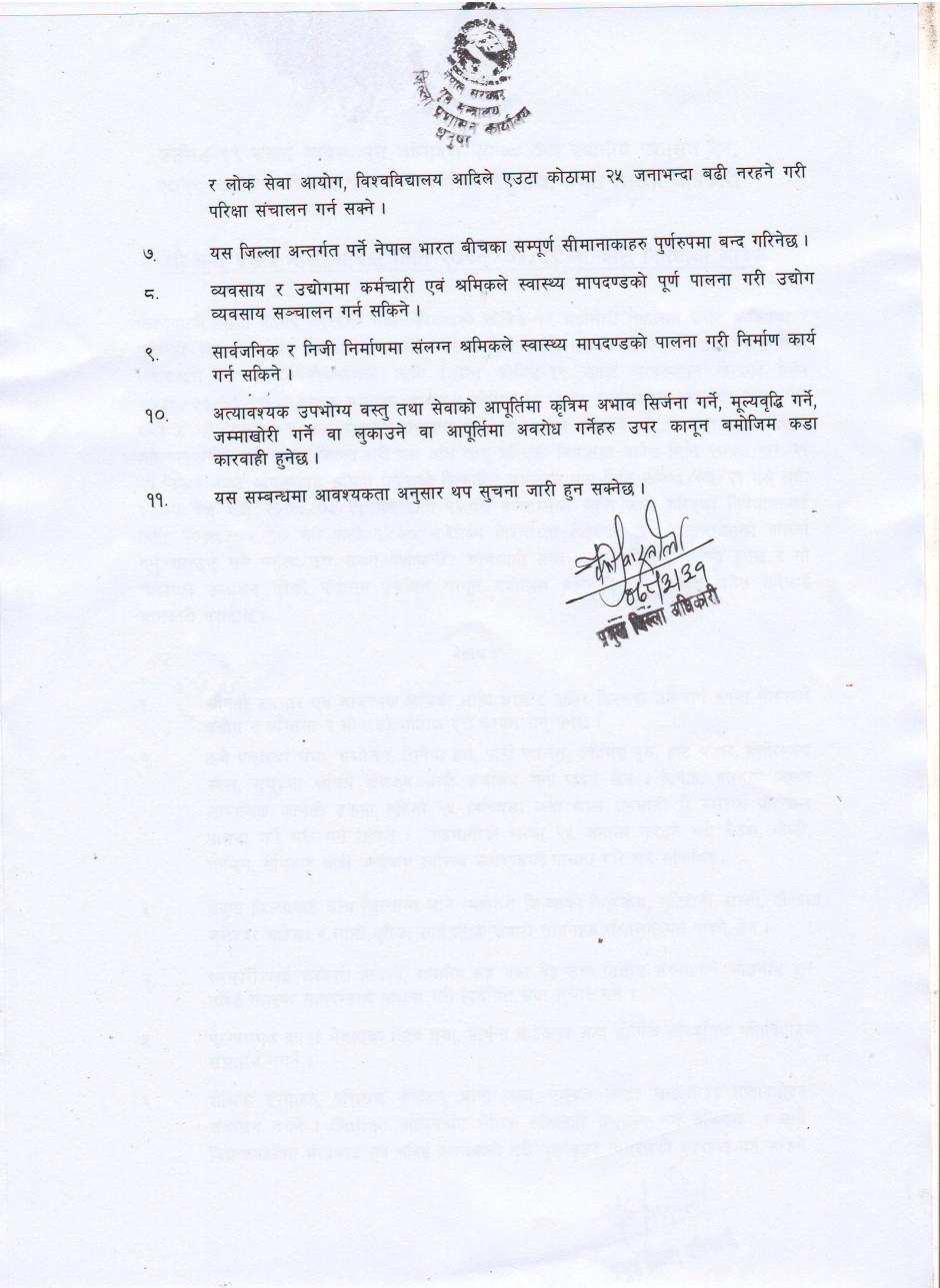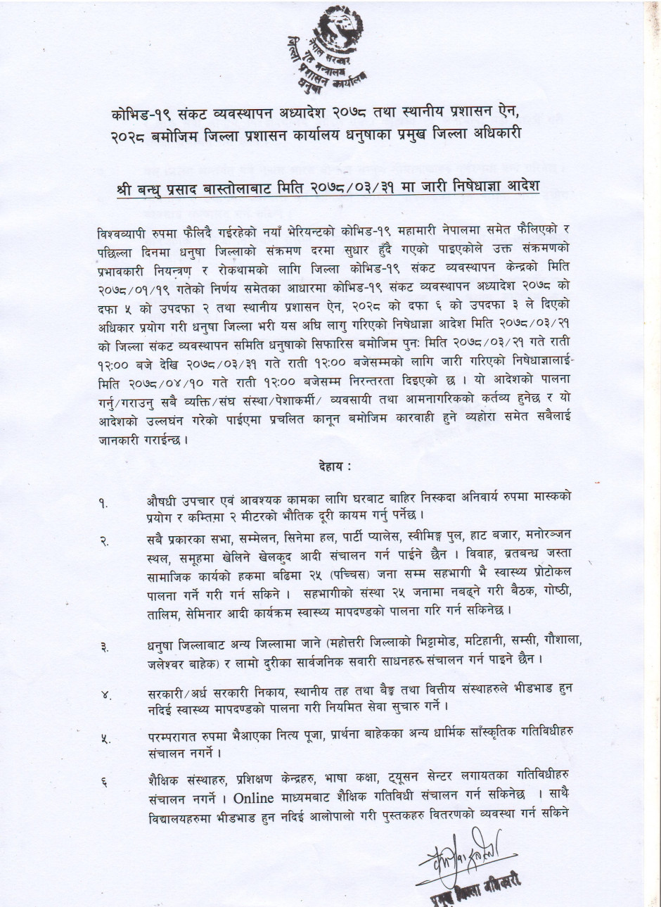 जिल्ला प्रशासन कार्यालय धनुषाबाट अवधि थप गरि जारी गरिएको निषेधाज्ञा आदेश