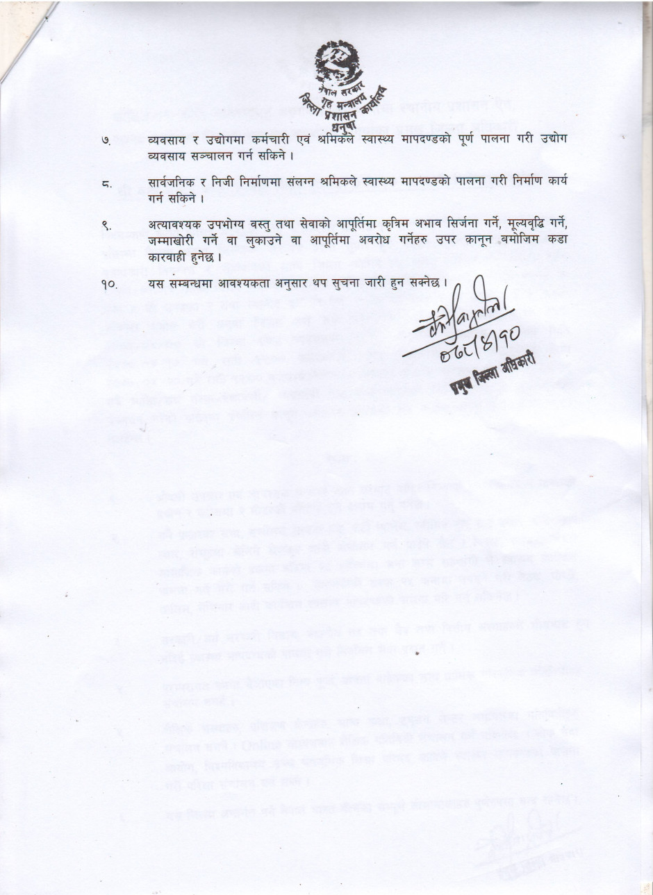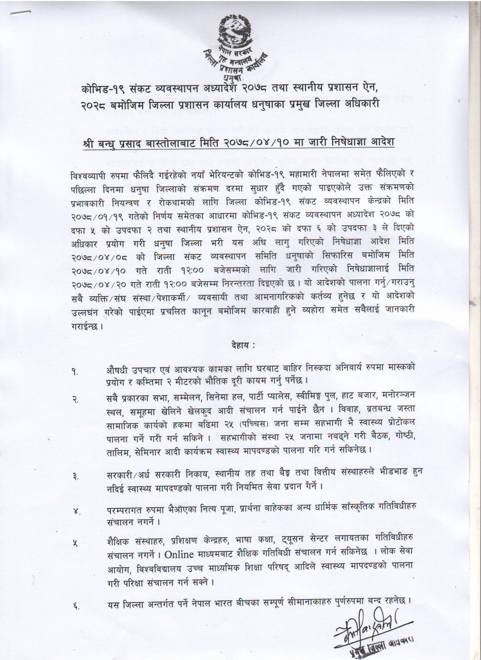 जिल्ला प्रशासन कार्यालय धनुषाबाट अवधि थप गरि जारी गरिएको निषेधाज्ञा आदेश