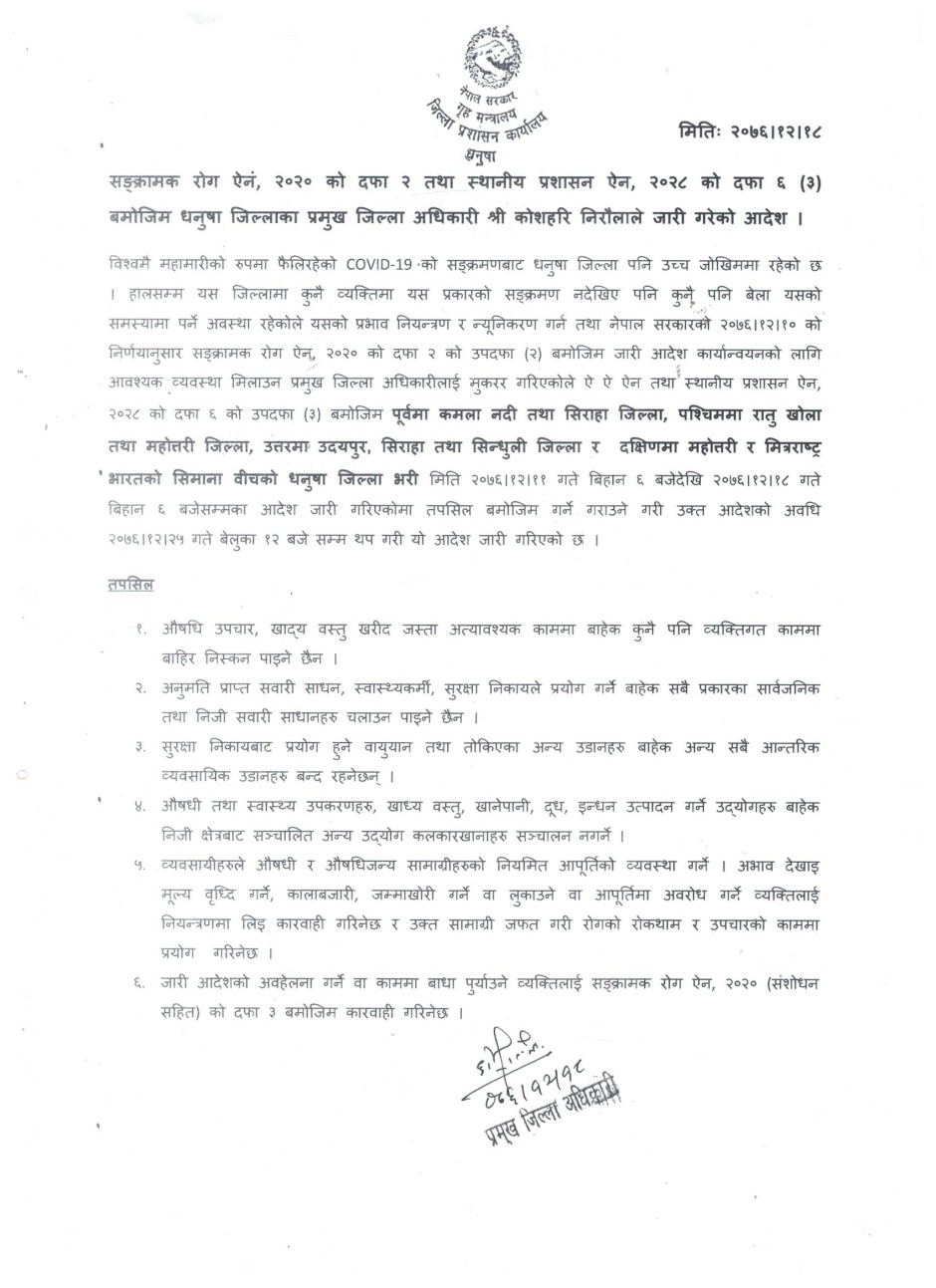 जिल्ला प्रशासन कार्यालय धनुषाबाट जारी गरिएको आदेश