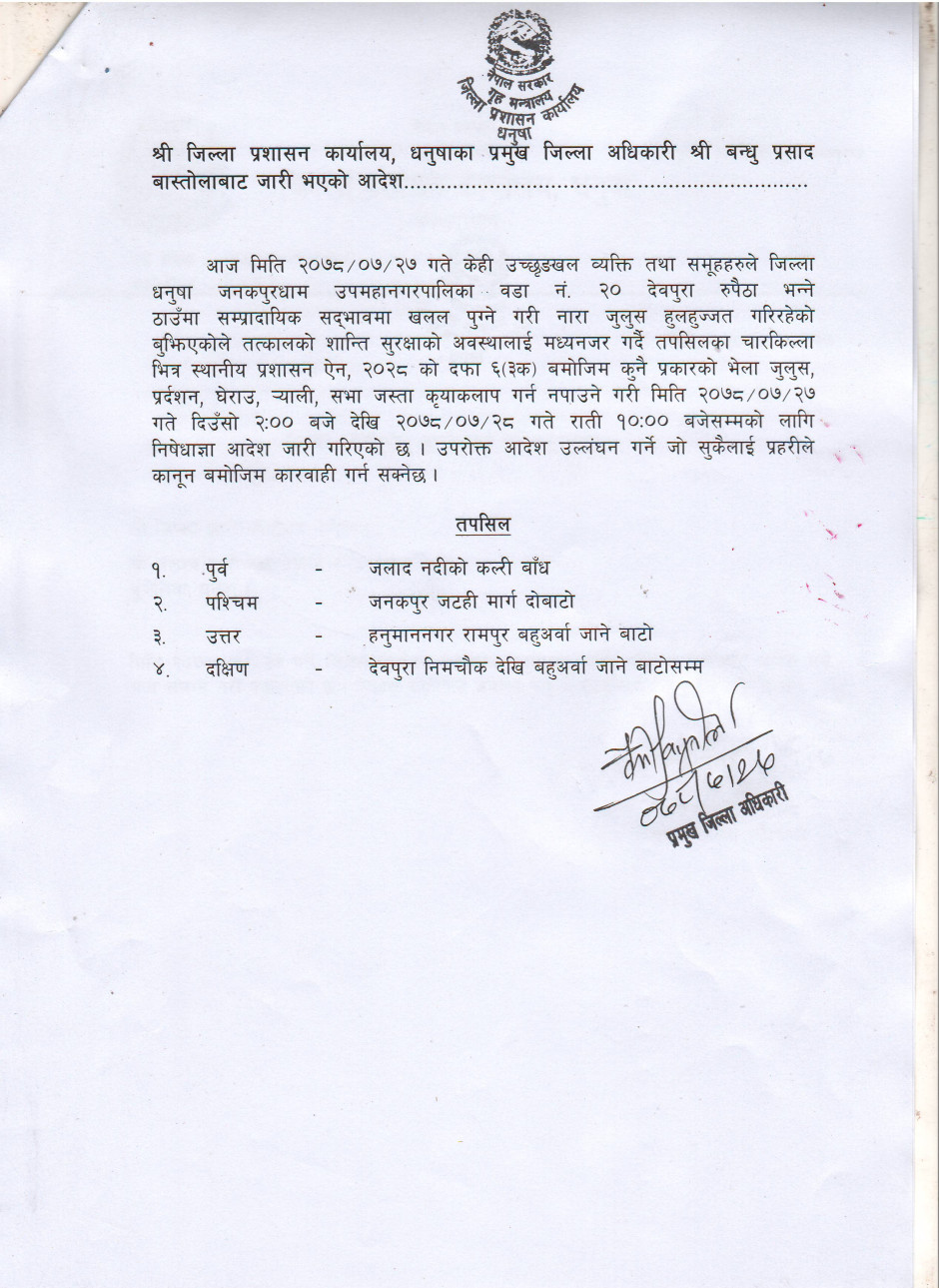 जिल्ला प्रशासन कार्यालय धनुषाबाट जारी गरिएको निषेधाज्ञा आदेश