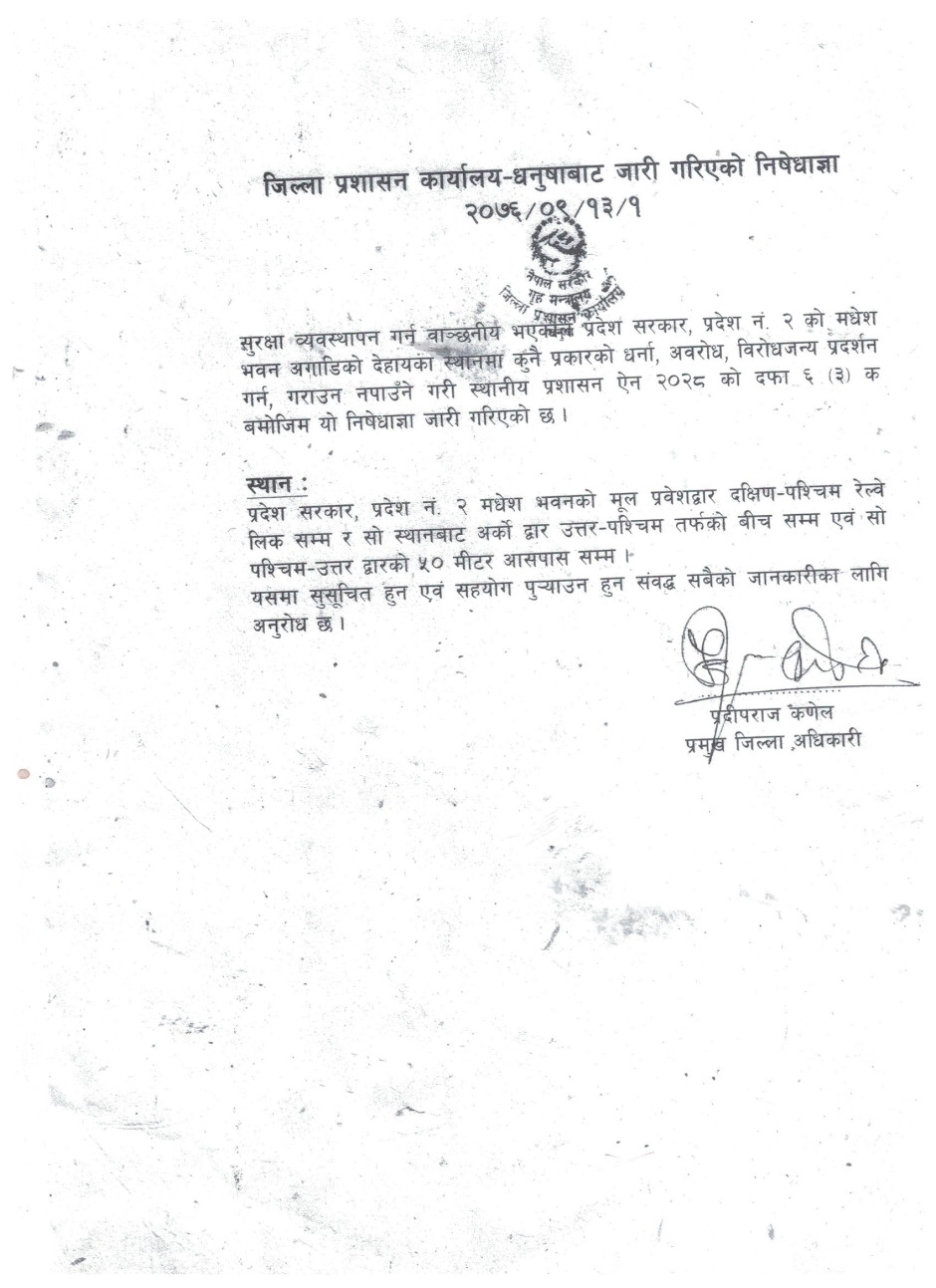जिल्ला प्रशासन कार्यालय–धनुषाबाट जारी गरिएको निषेधाज्ञा