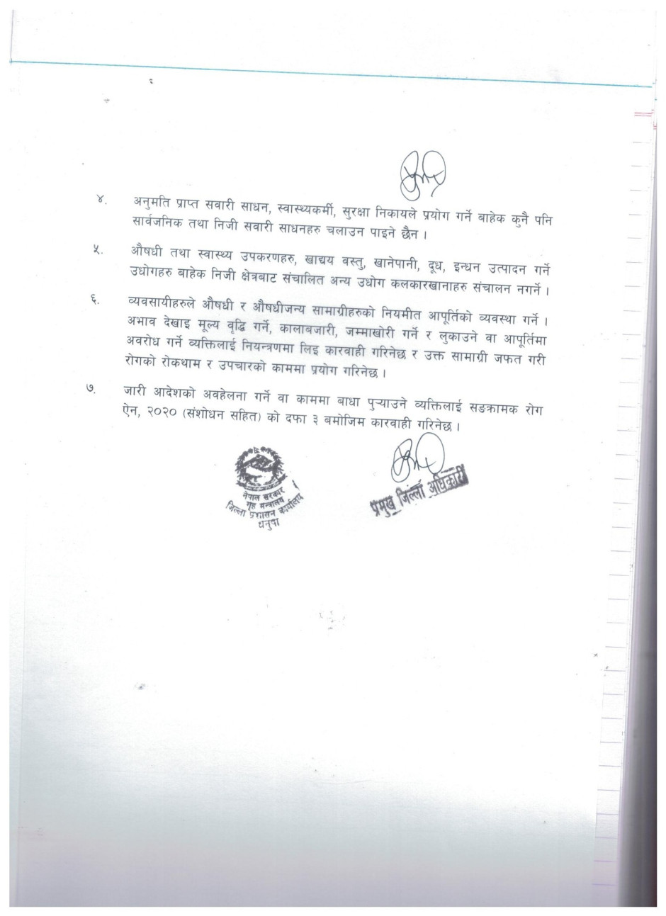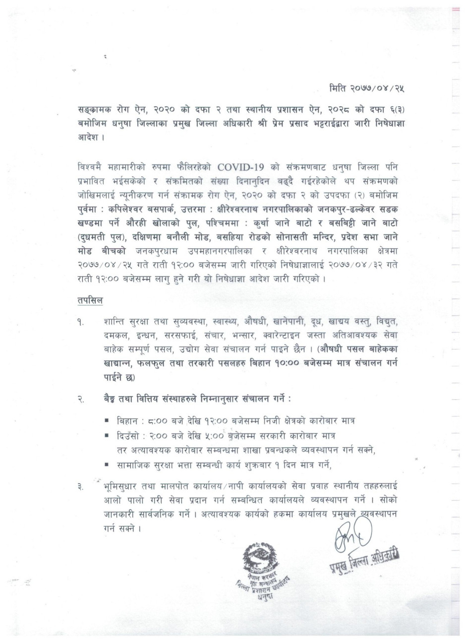 जिल्ला प्रशासन कार्यालय धनुषाबाट जारी गरिएको निषेधाज्ञा आदेश
