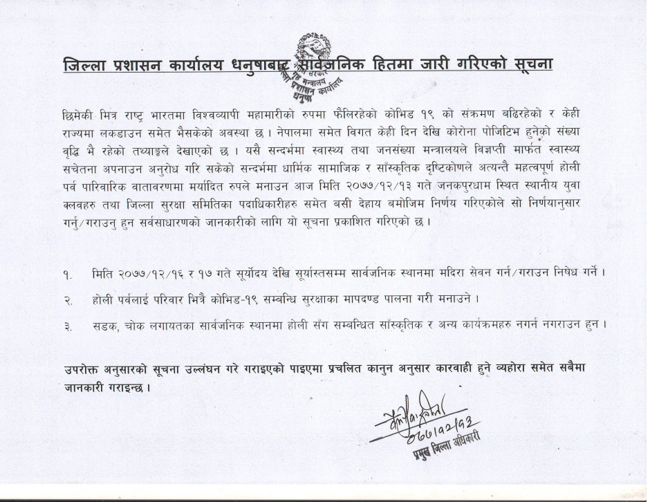 जिल्ला प्रशासन कार्यालय धनुषाबाट सार्वजनिक हितमा जारी गरीएको सूचना