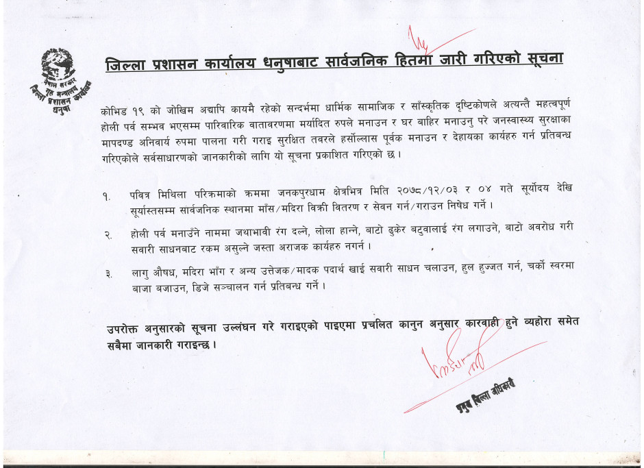 जिल्ला प्रशासन कार्यालय धनुषाबाट सार्वजनिक हितमा जारी गरिएको सूचना
