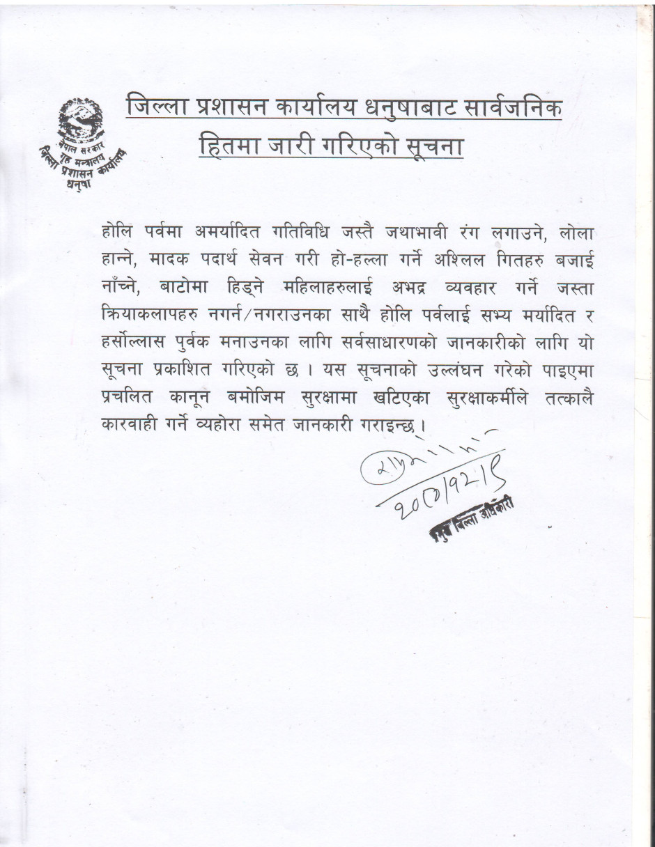 जिल्ला प्रशासन कार्यालय धनुषाबाट सार्वजनिक हितमा जारी गरिएको सूचना