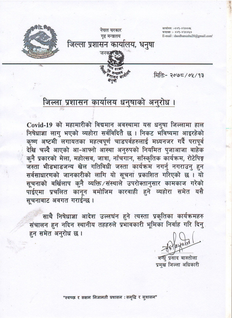 जिल्ला प्रशासन कार्यालय धनुषाको अनुरोध