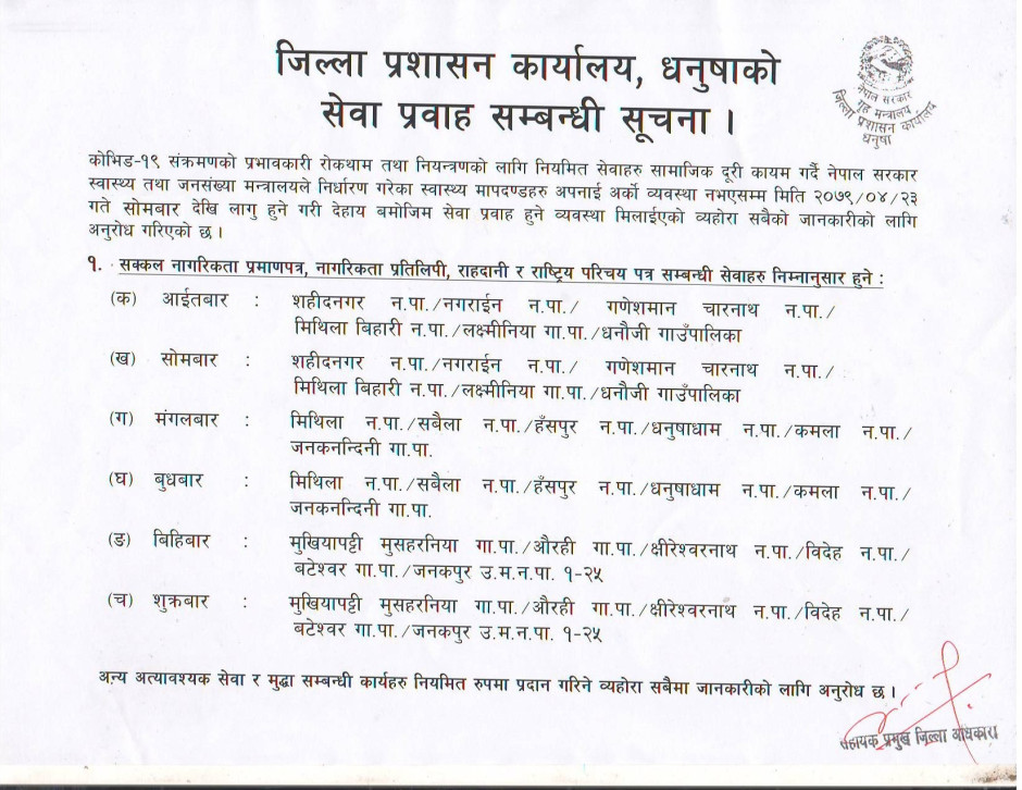 जिल्ला प्रशासन कार्यालय धनुषाको सेवा प्रवाह सम्बन्धी सूचना