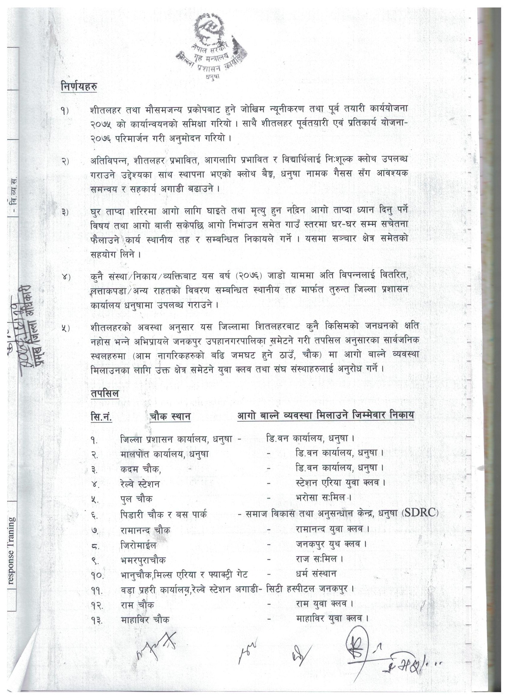 जिल्ला विपद् व्यवस्थापन समिति धनुषाको मिति २०७६-०७-२१ गतेको बैठकबाट विभिन्न निर्णय भएको ।