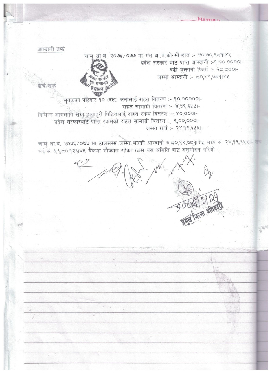 जिल्ला विपद् व्यवस्थापन समिति धनुषाको मिति २०७६-०४-०१ गते देखि हालसम्मको खर्च अनुमोदन गरियो ।