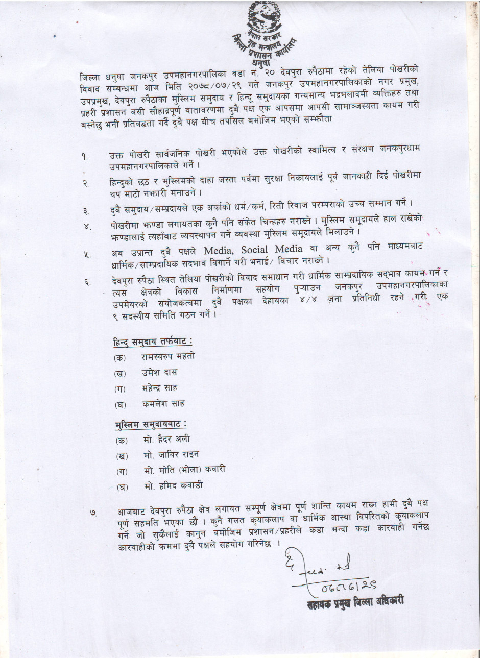जि.ध. जनकपुर उ.म.न.पा. २० देवपुरा रुपैठाको तेलिया पाेखरीकाे विवाद सम्बन्धमा दुबै पक्ष भएको सम्झौता