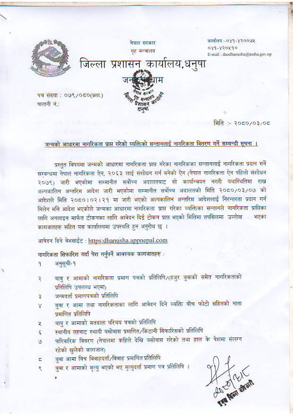 जन्मको आधारमा नागरिकता प्राप्त गरेकाे व्यक्तिकाे सन्तानलाई नागरिकता वितरण गर्ने सम्बन्धी सूचना ।
