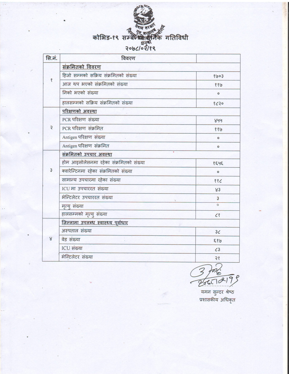 २०७८/०२/१९ काेभिड १९ सम्बन्धी दैनिक गतिविधी