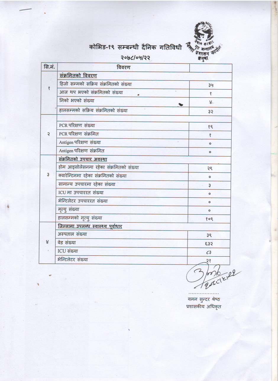 २०७८/०५/२२ काेभिड १९ सम्बन्धी दैनिक गतिविधी