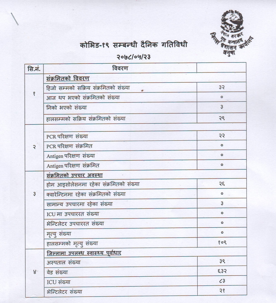 २०७८/०५/२३ काेभिड १९ सम्बन्धी दैनिक गतिविधी