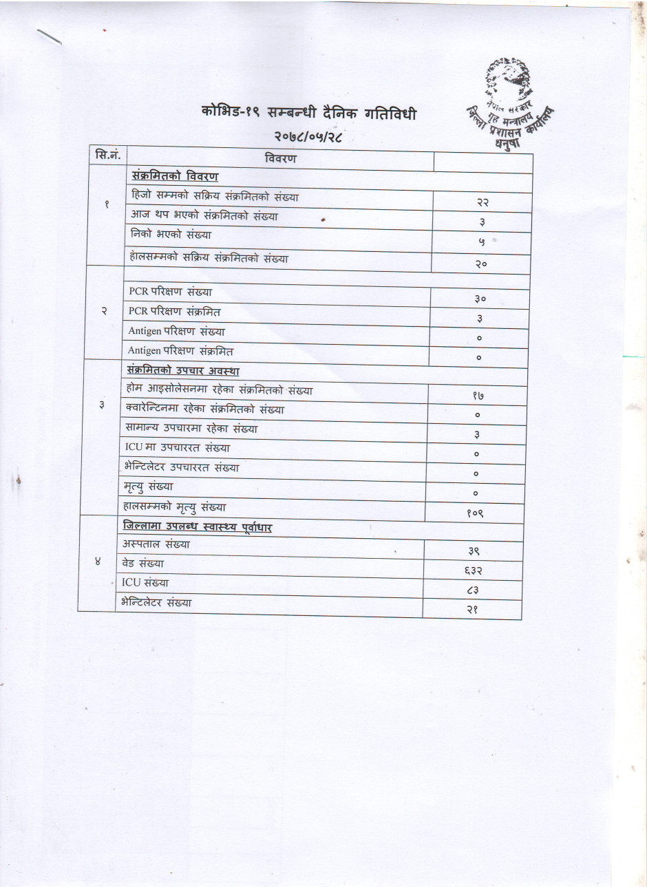 २०७८/०५/२९ काेभिड १९ सम्बन्धी दैनिक गतिविधी