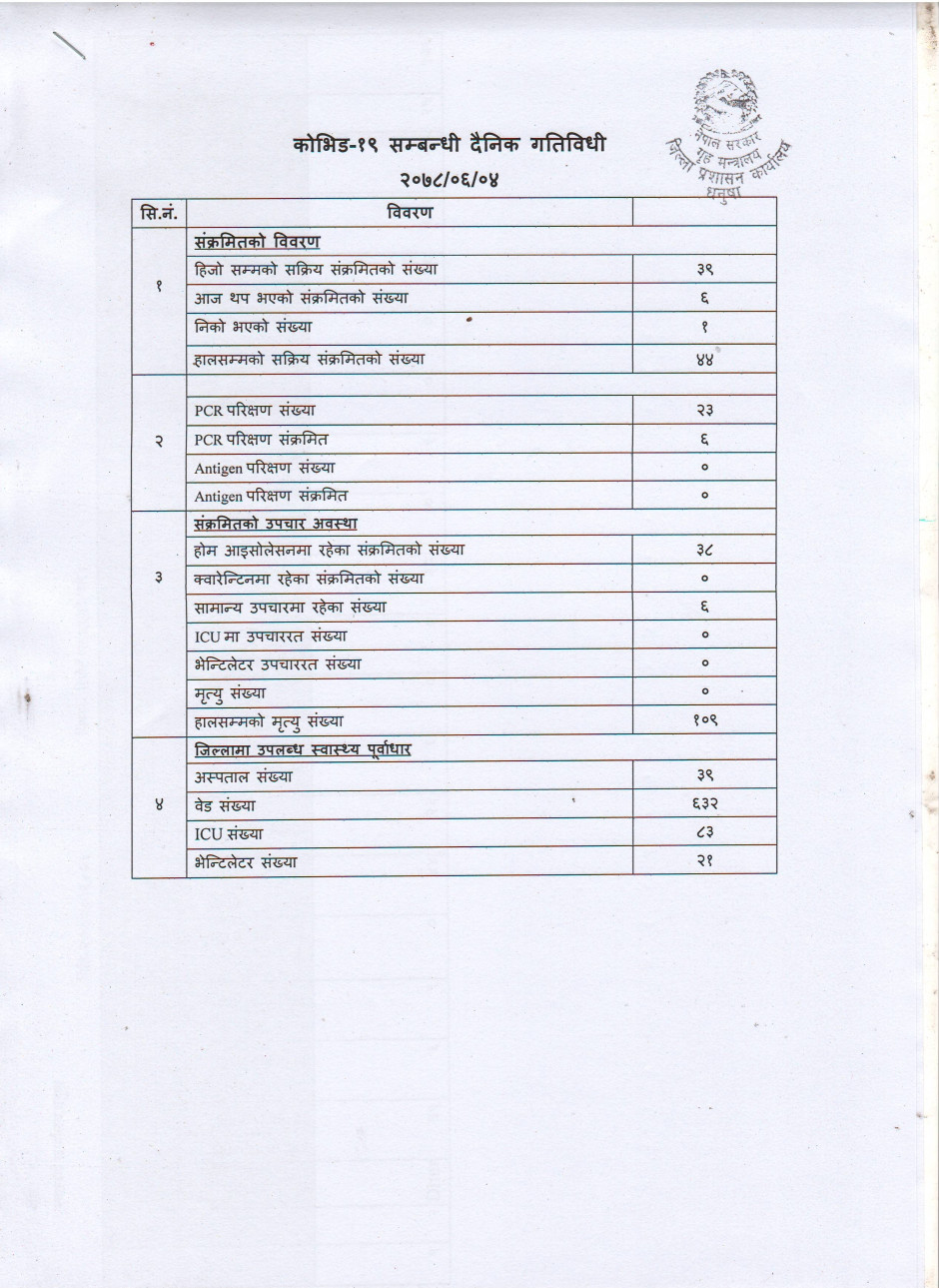 २०७८/०६/०४ काेभिड १९ सम्बन्धी दैनिक गतिविधी