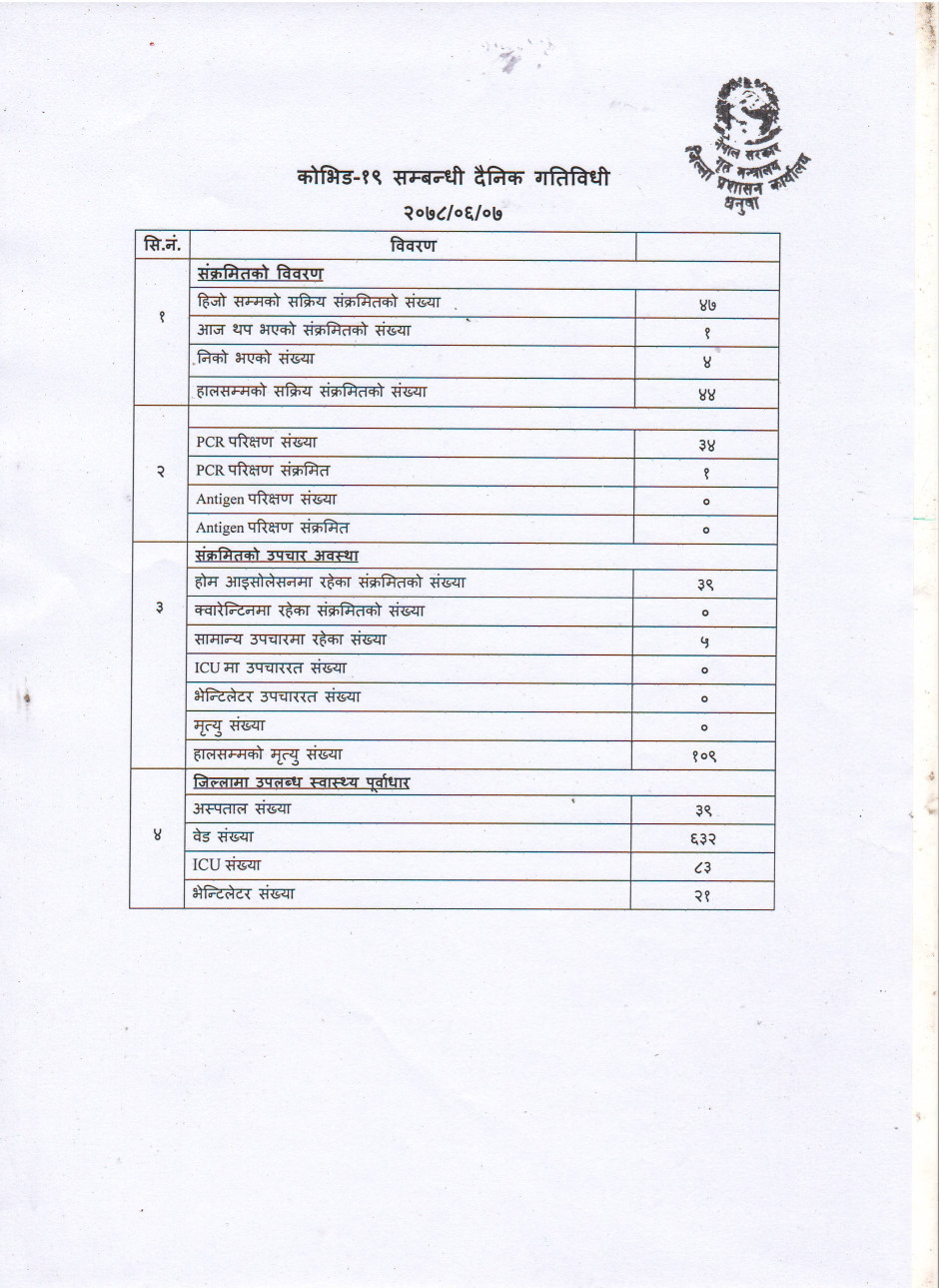 २०७८/०६/०७ काेभिड १९ सम्बन्धी दैनिक गतिविधी