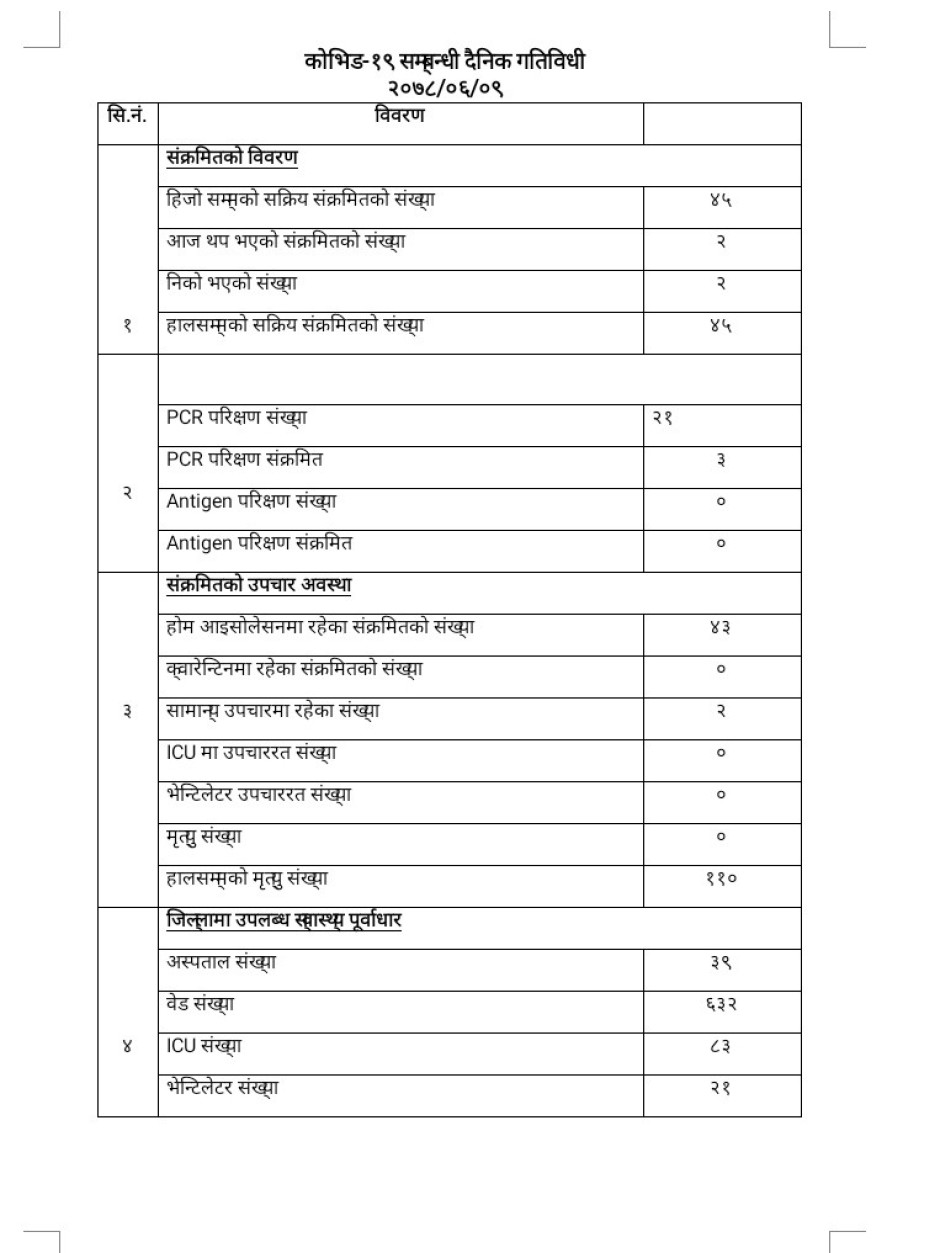 २०७८/०६/०९ काेभिड १९ सम्बन्धी दैनिक गतिविधी