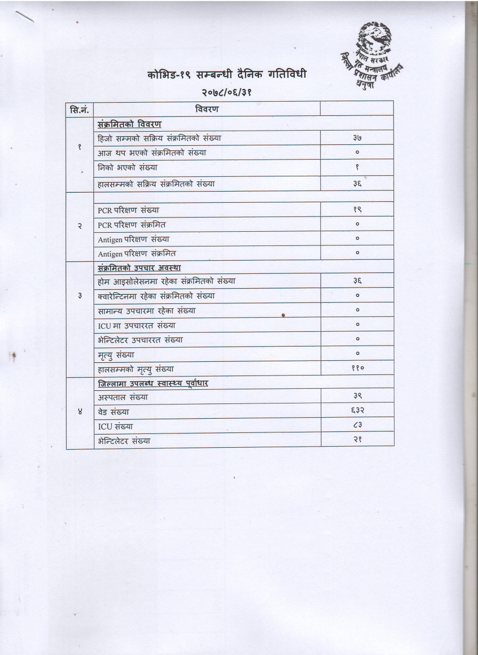२०७८/०६/३१ काेभिड १९ सम्बन्धी दैनिक गतिविधी