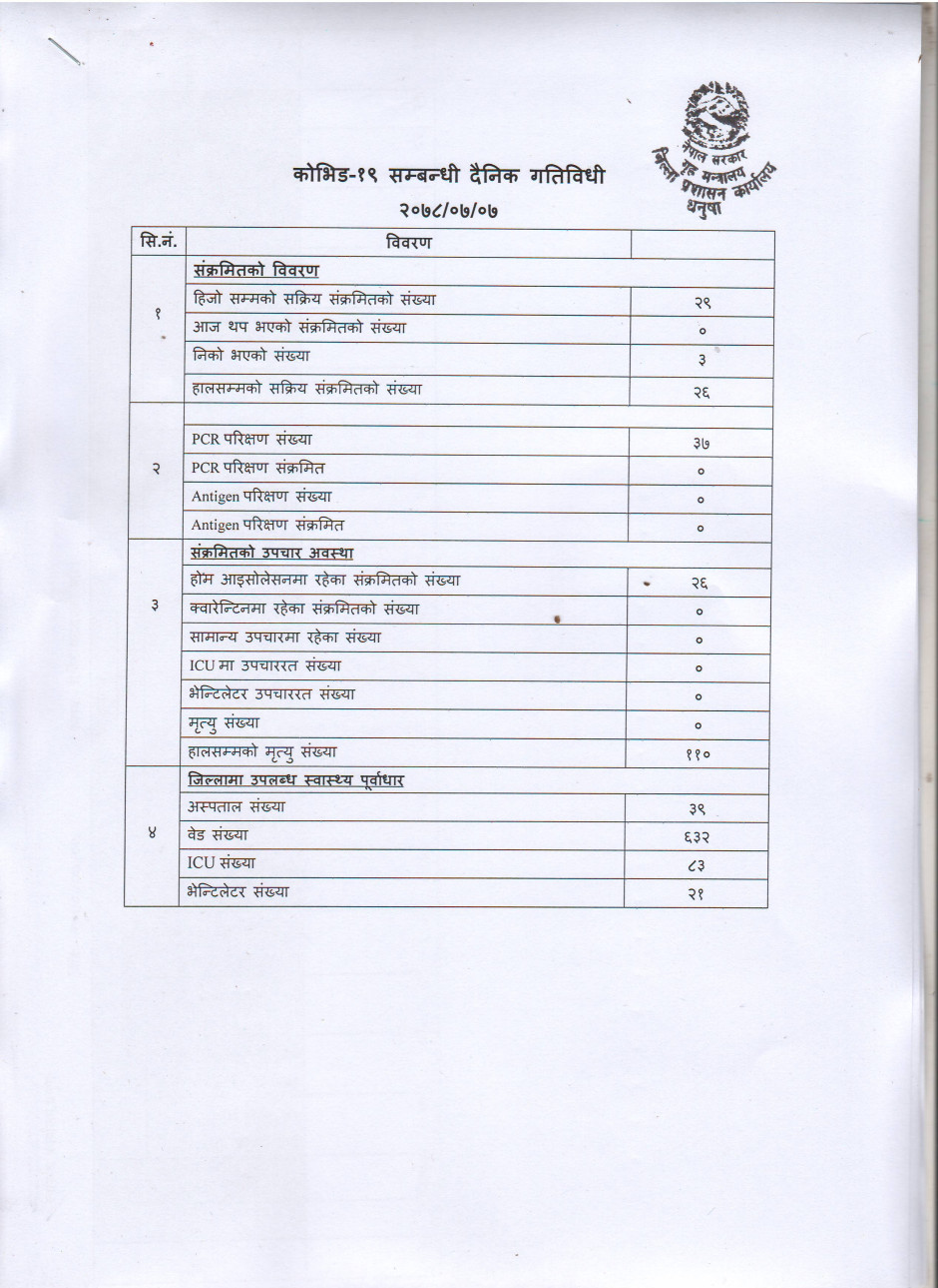 २०७८/०७/०७ काेभिड १९ सम्बन्धी दैनिक गतिविधी