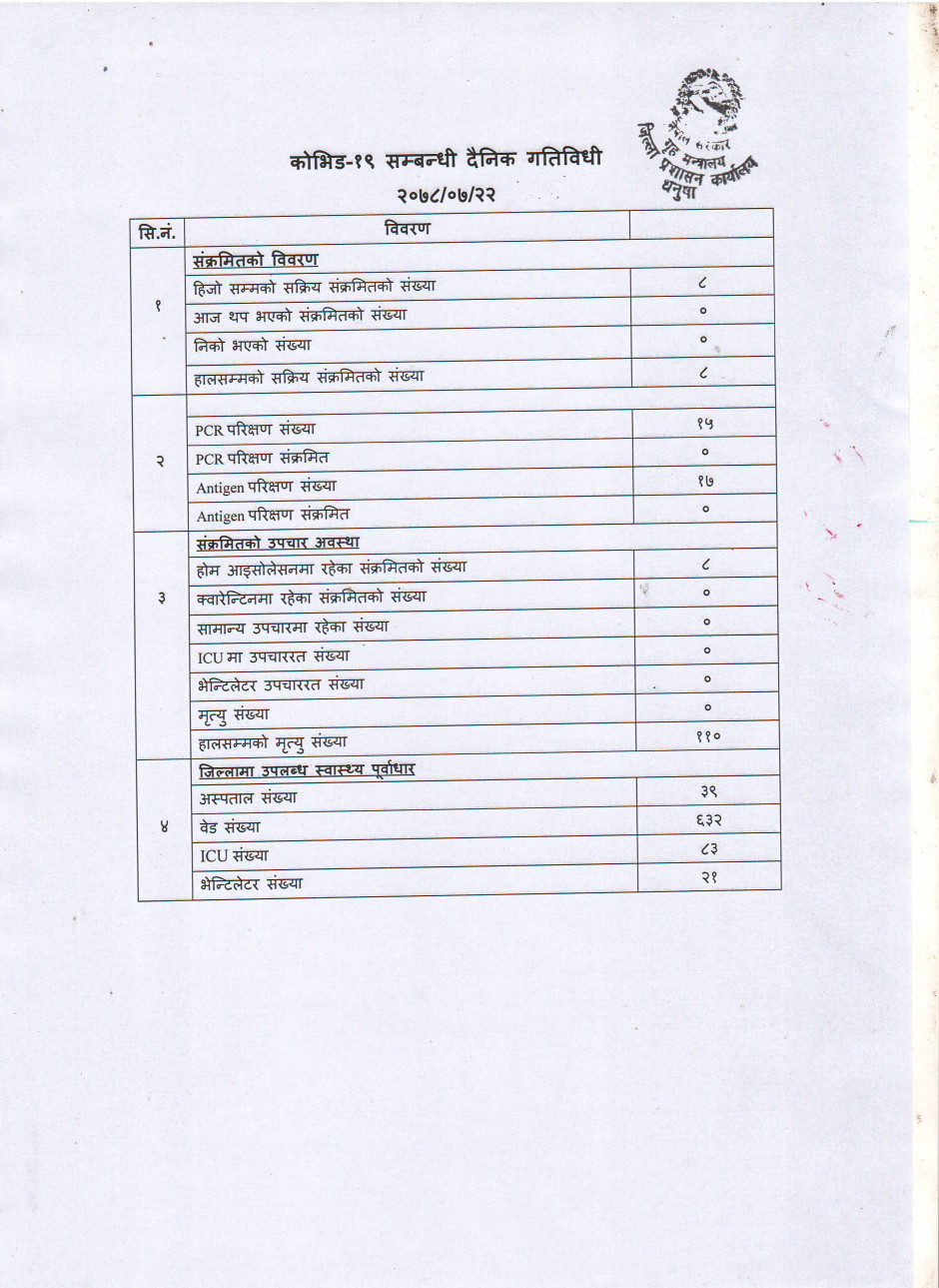 २०७८/०७/२२ काेभिड १९ सम्बन्धी दैनिक गतिविधी