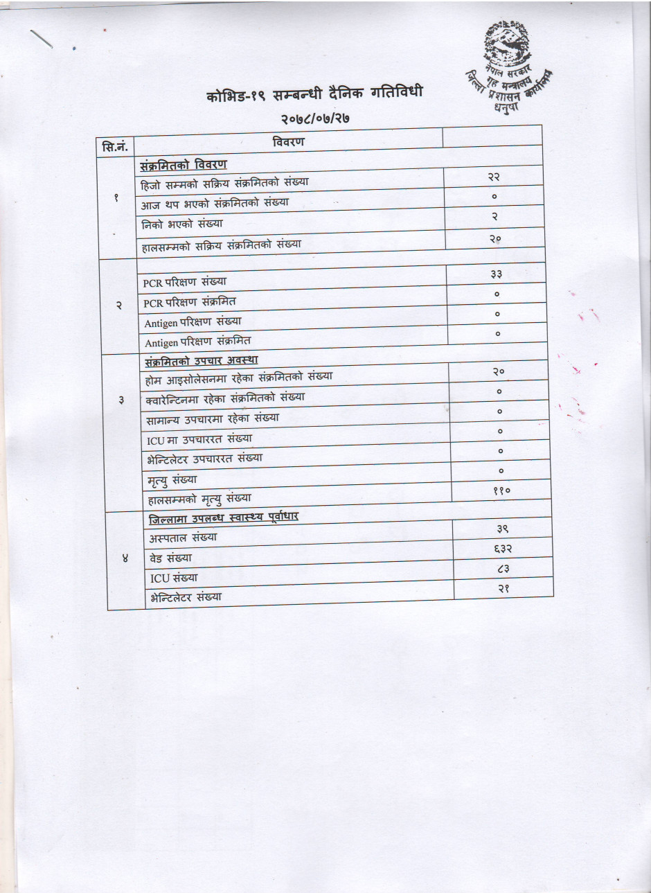 २०७८/०७/२७ काेभिड १९ सम्बन्धी दैनिक गतिविधी