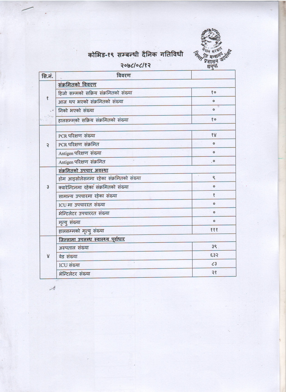 २०७८/०८/१२ काेभिड १९ सम्बन्धी दैनिक गतिविधी