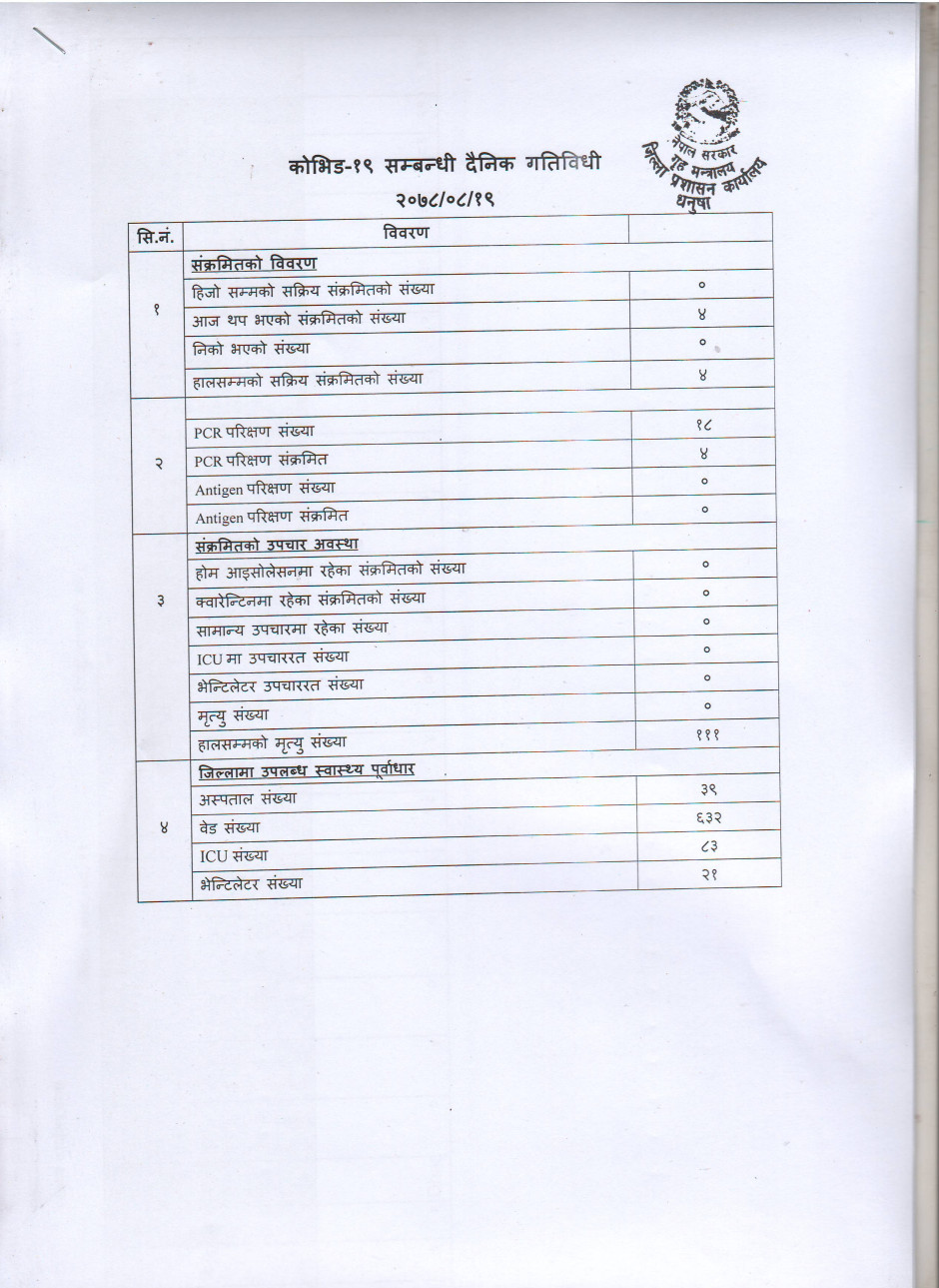 २०७८/०८/१९ काेभिड १९ सम्बन्धी दैनिक गतिविधी