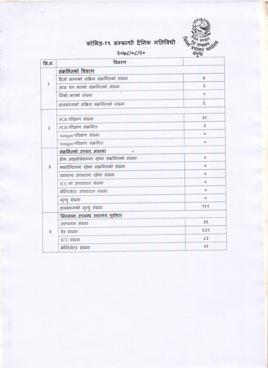 २०७८/०८/२० काेभिड १९ सम्बन्धी दैनिक गतिविधी
